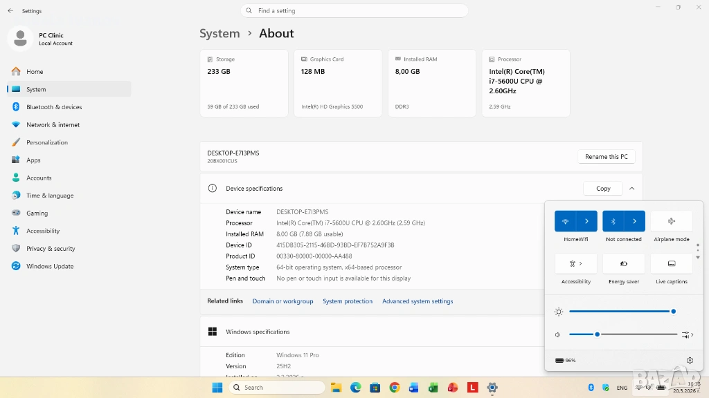 Лаптопът е пазен, с нормални, минимални следи от употреба по корпуса, типични за времето си. Екранът е без забележки.