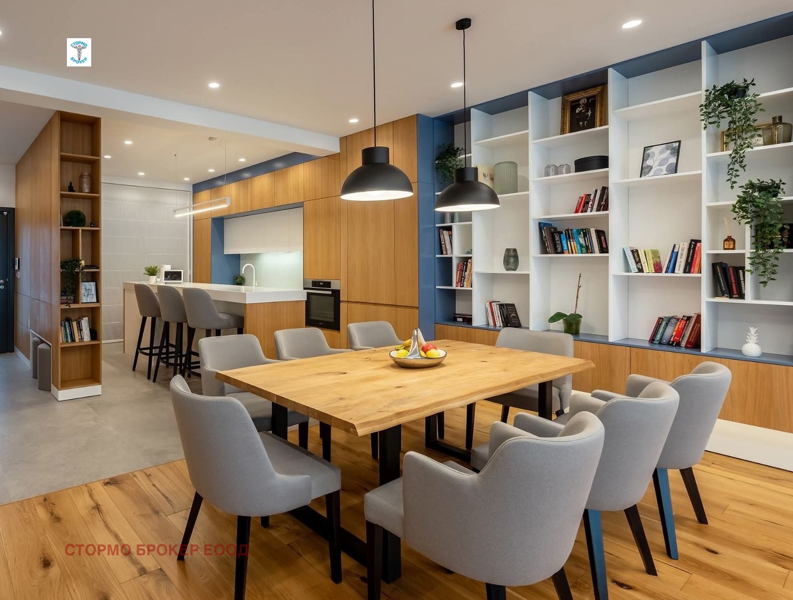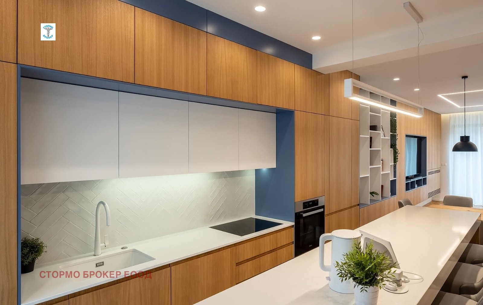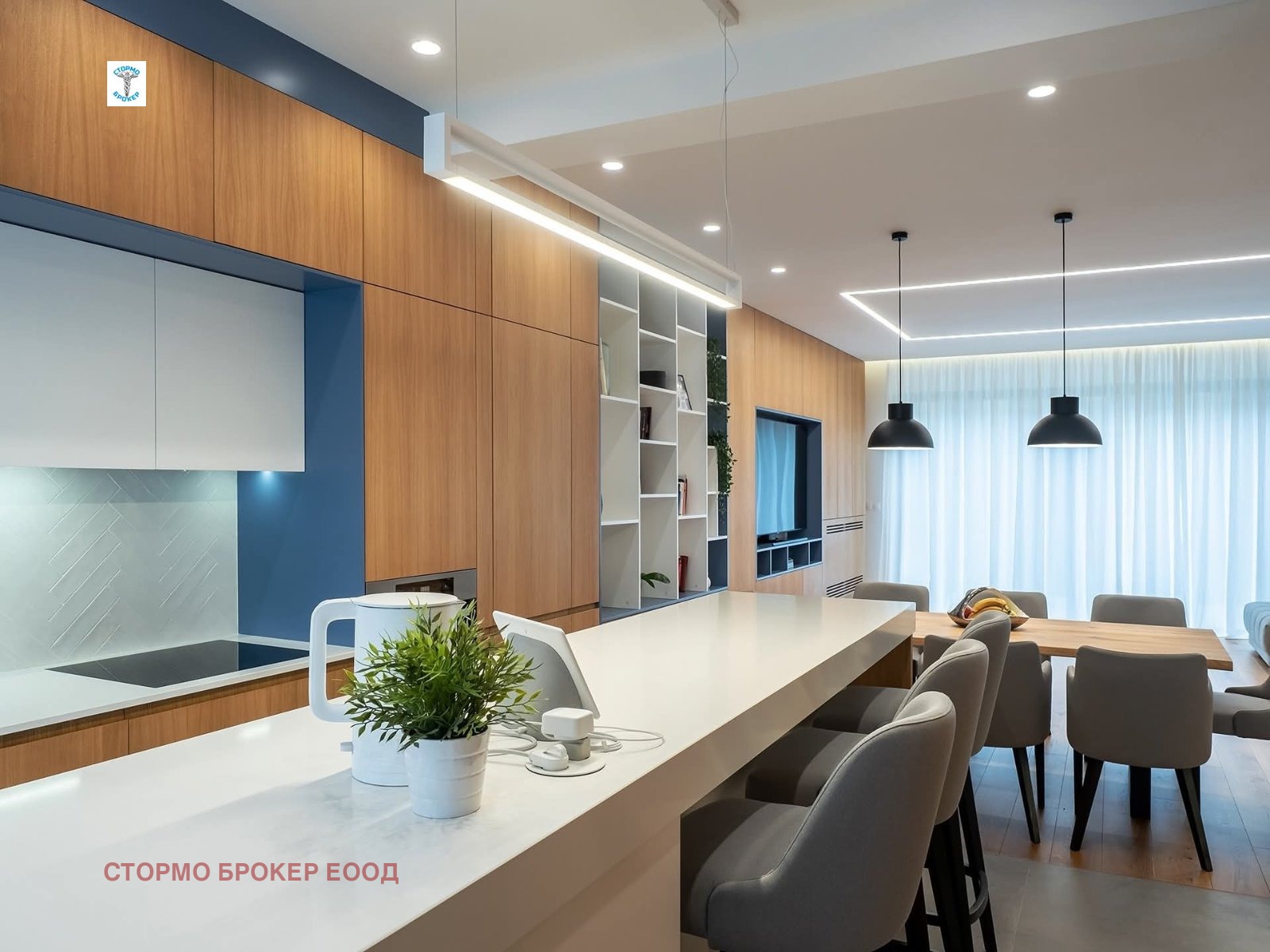 На първото ниво е разположена просторна и светла всекидневна с трапезария и модерна кухненска част, напълно оборудвана с висок клас уреди: