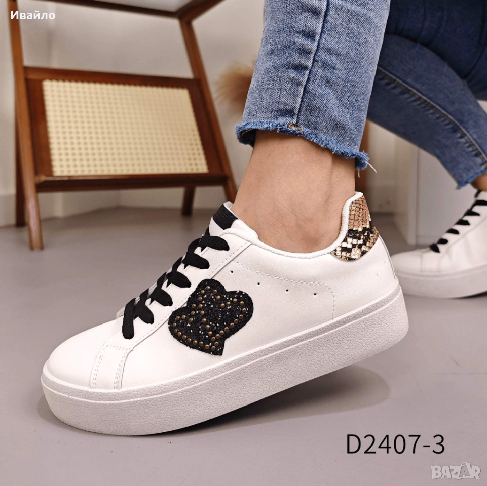 Изчистеният дизайн е обогатен с интересни детайли, които правят обувките отличителни и актуални. Декоративното сърце със ситни елементи придава лек блясък и модерен характер, а контрастът между бяло и черно създава стилна и универсална визия. Те са подходящи както за ежедневието, така и за по-небрежни градски аутфити.