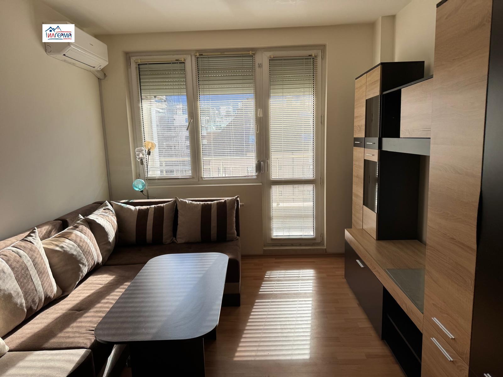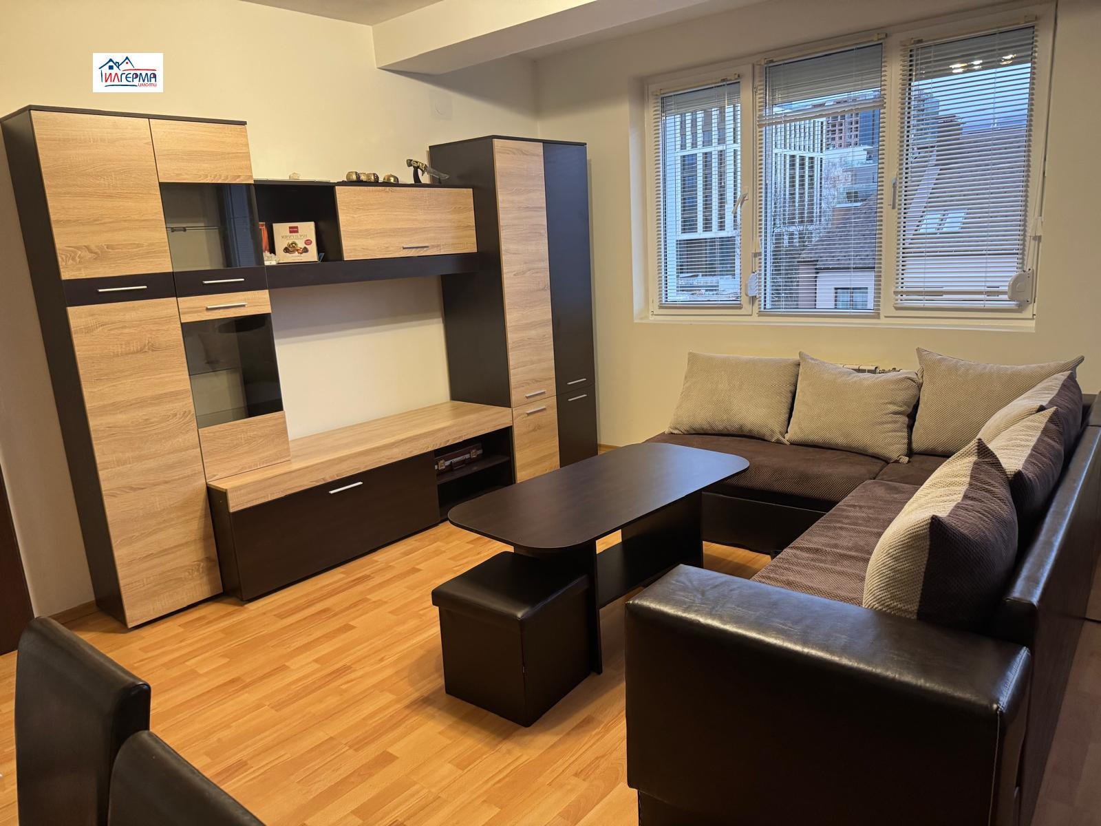 Обзавеждане: диван, холна маса, секция и трапезна маса със столове.