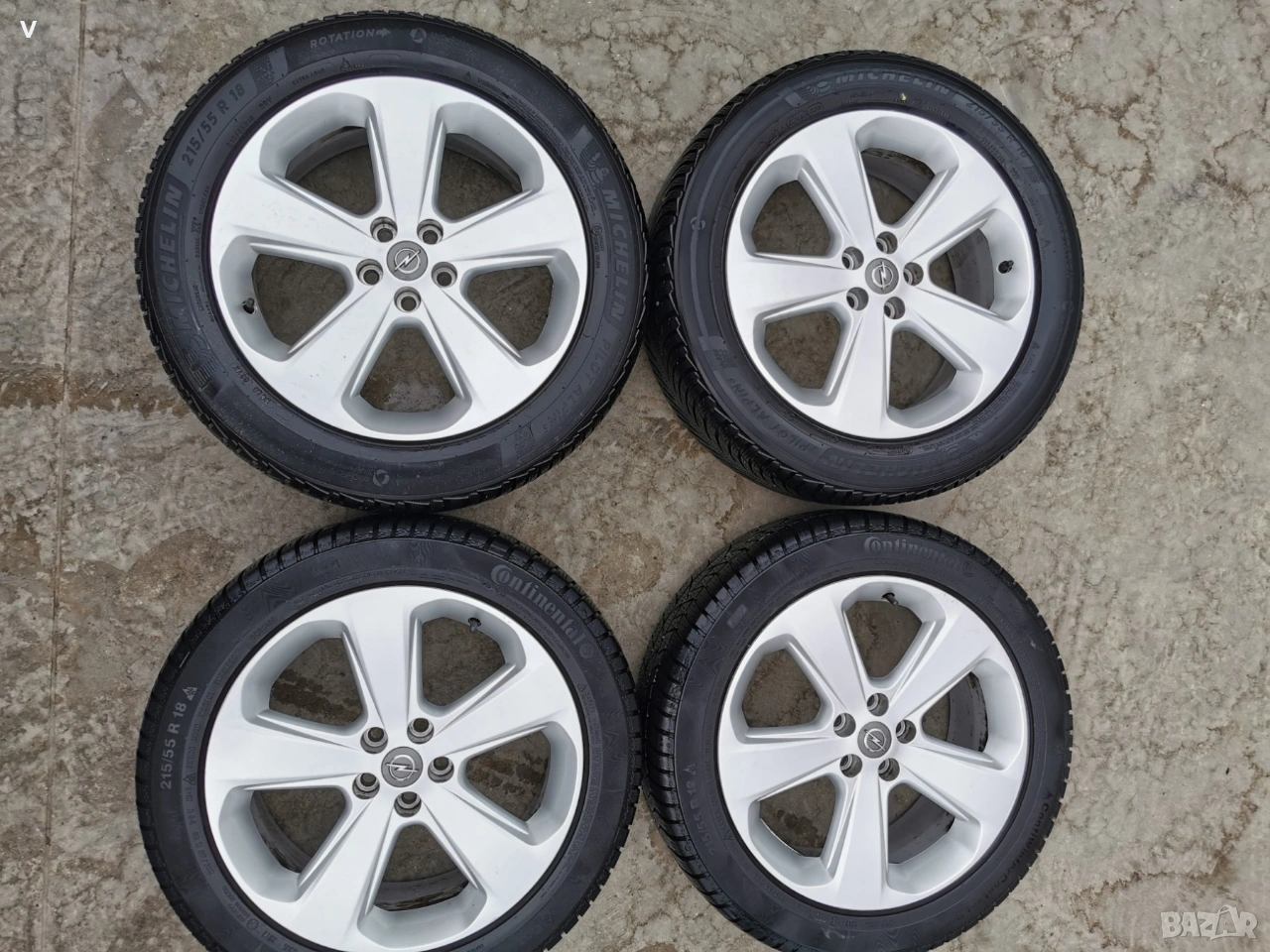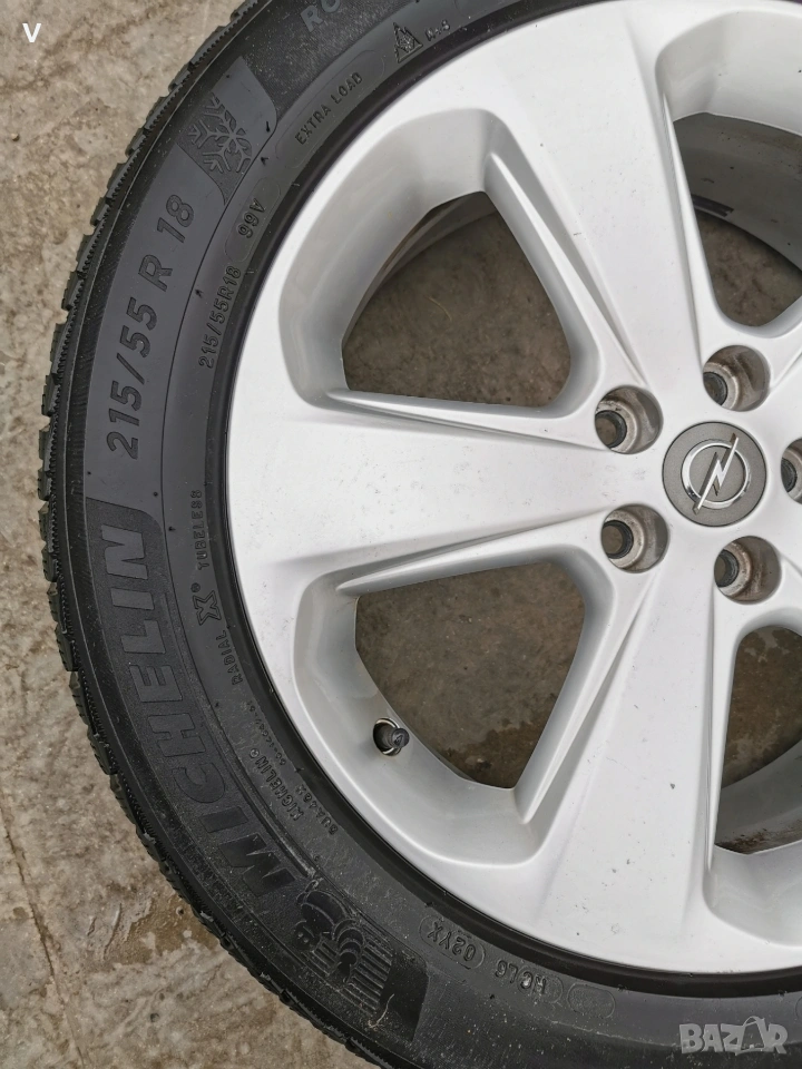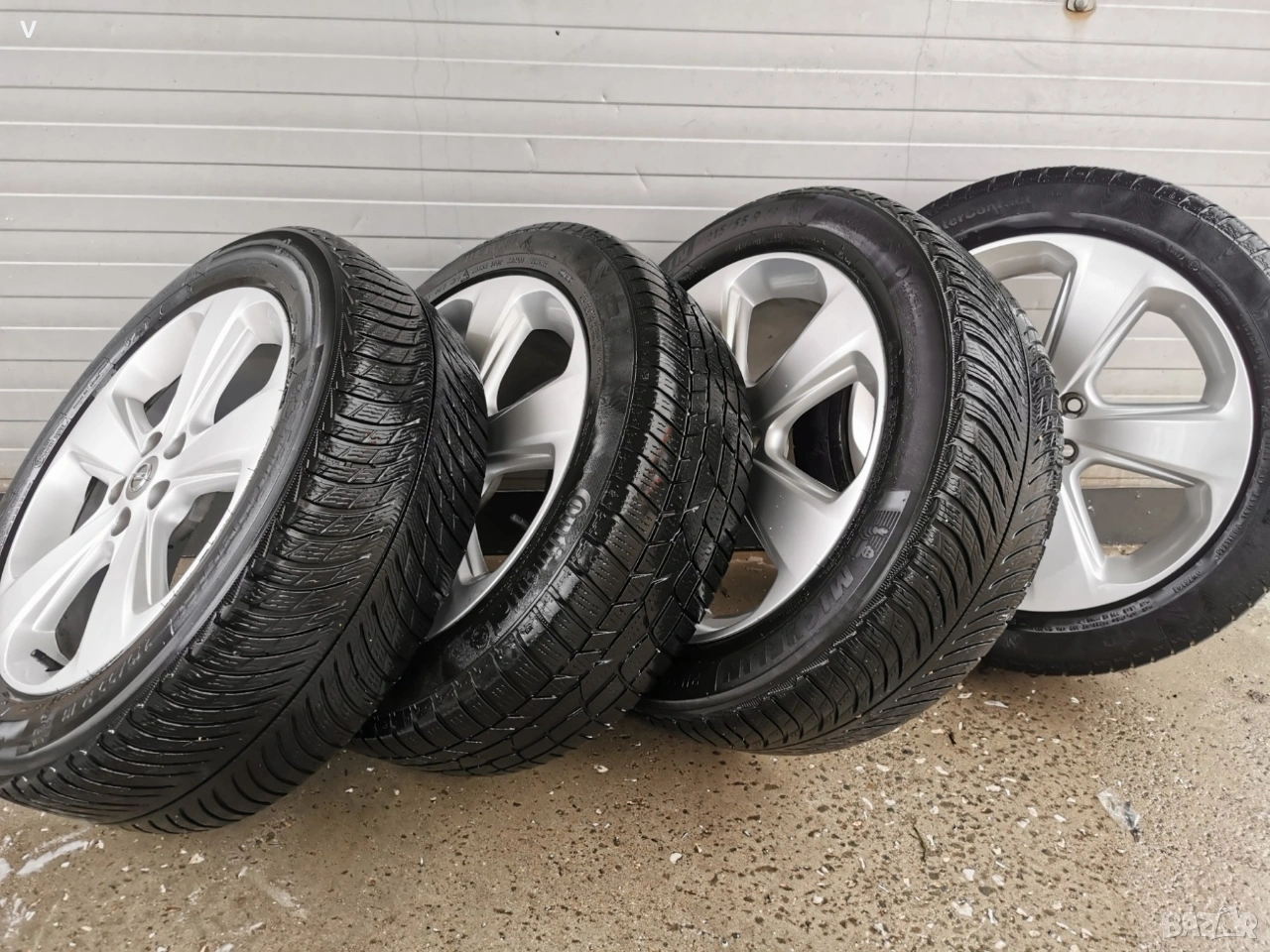 Оригинални джанти за Опел Мока, без забележки, 5X105 ET 38, централен отвор 56,6. Към тях вървят и 4 зимни гуми висок клас - две на Мишелин и две на Континентал, с големи грайфери. Размер на гумите 215 / 55 / R 18.