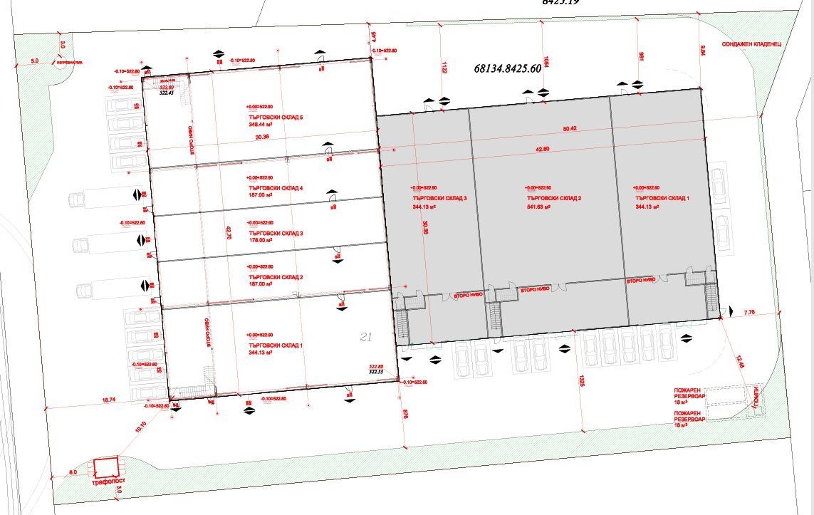 ниво 1 - 442,15кв.м., офис - 98,20кв.м., хидрофорно помещение - 4,4кв.м.; ниво 2 - работно помещение - 69,86кв.м., санитерно помещение - 6.30кв.м.; 5бр. паркоместа (възможност за повече на брой места за паркиране), заедно със съответните идеални части от земята.