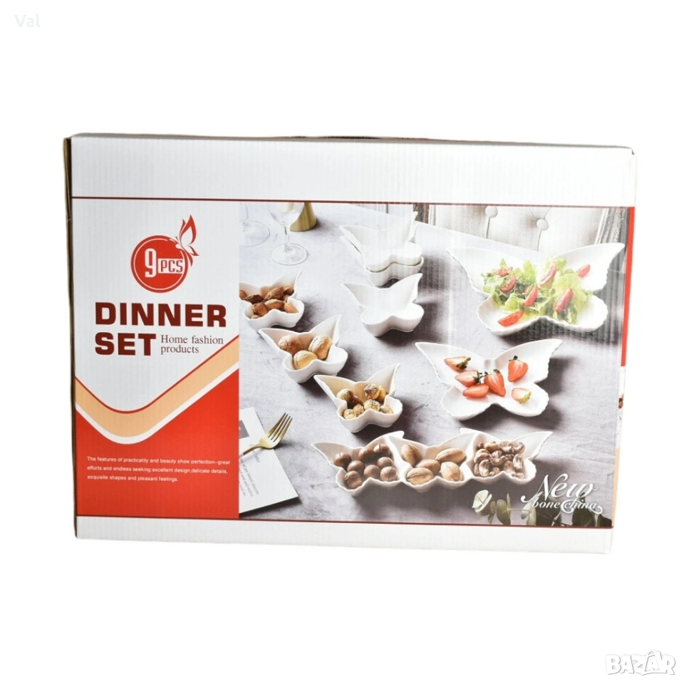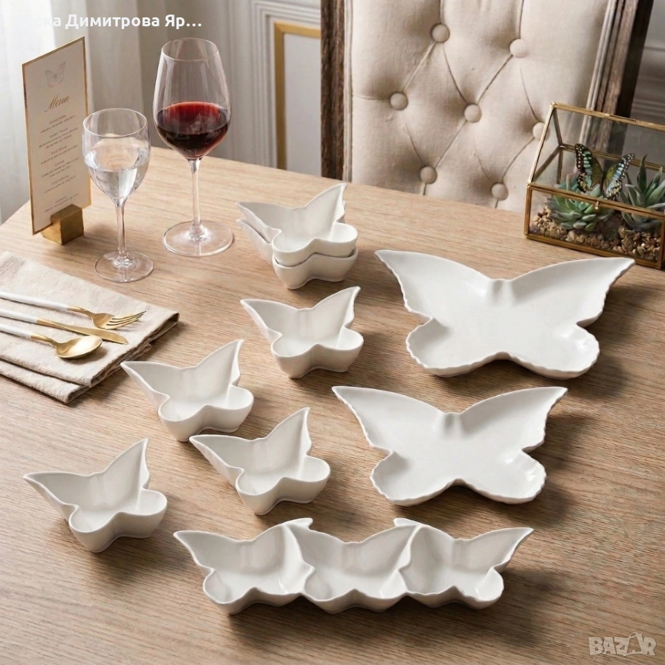 Елегантен комплект за сервиране от висококачествен порцелан, дизайн "Пеперуда" - 9 части