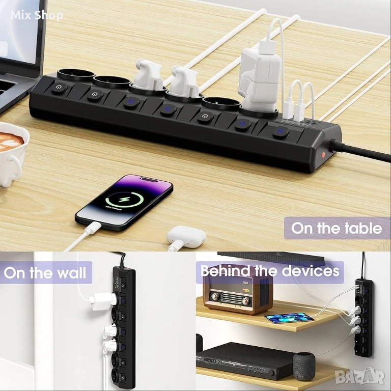 10-в-1 удължителен кабел с множество контакти- Разклонителят с 6 AC контакта и 3 USB-A порта и 1 USB-C порт (PD 20W), USB-C портът за зареждане е оборудван с интелигентна технология за зареждане, която регулира изходния ток за оптимално зареждане. Зареждайте мобилния си телефон, лаптоп без конвертор, спестявайте място и организирайте бюрото си. Ефективно преобразувайте 1 стенен контакт в 10, без да оставате без контакти.