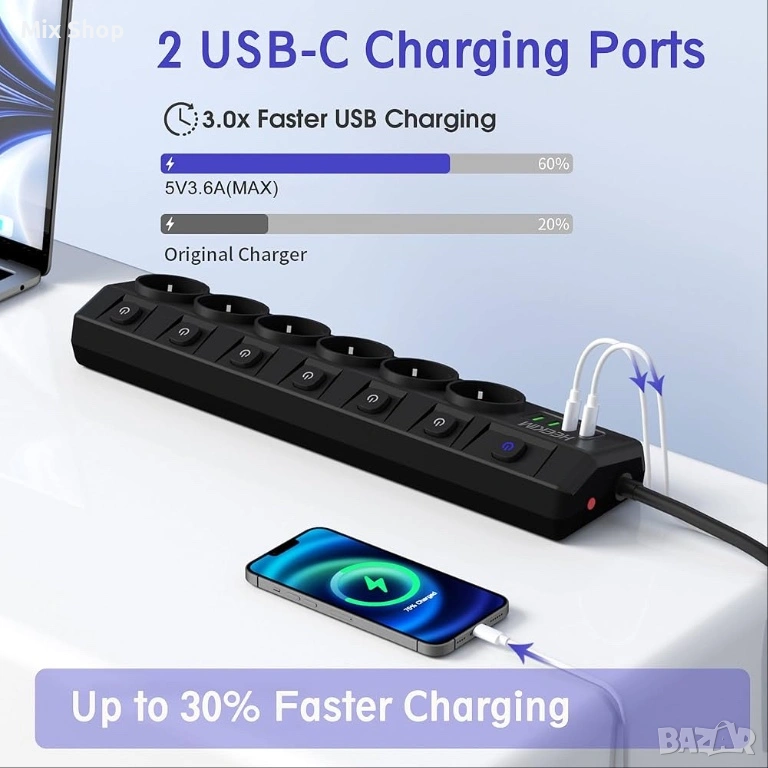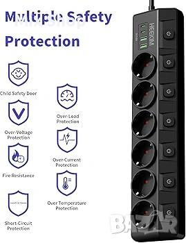 Индивидуално превключващ се разклонител с 6 контакта и 3 USB-A и 1 USB-C