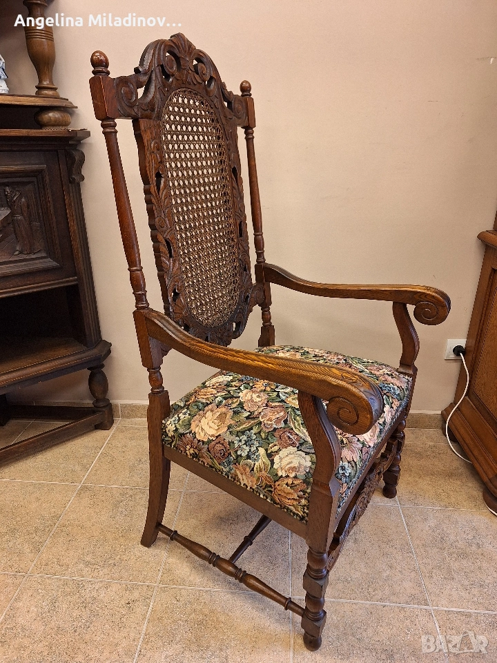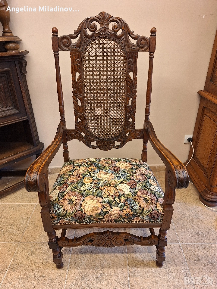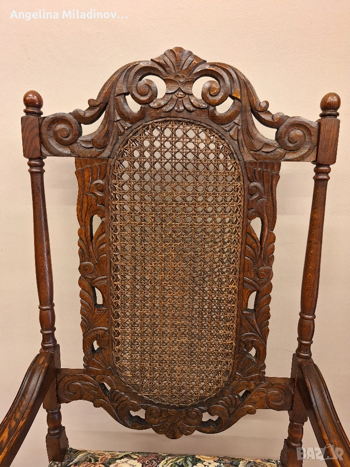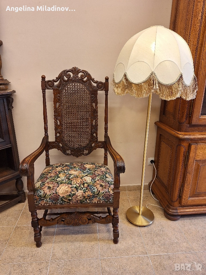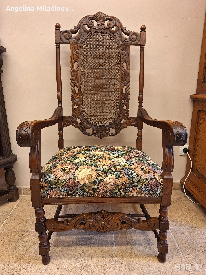 УНИКАТ! Кресло орех масив от края на 19-ти век. Креслото е от Каролското възраждане, обилно издълбано със свитъци и медальони от акантови листа. Гърба на креслото е от естествен ратан. Под ръчно бродираната седалка има елегантна кабриола. Месингови капси допълват красотата на креслото. Разгледайте и другите ми обяви. Последвайте ни и във фейсбук Мебели шик. Предлагаме и изгоден транспорт за цялата страна. Размери: Дължина - 65 см. Ширина - 65 см. Височина - 127 см. Цена - 260 €. 508,52 лв. vintagemebel.olx.bg
