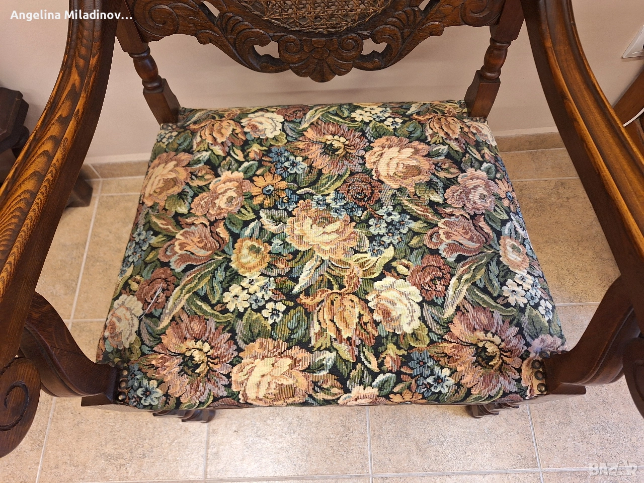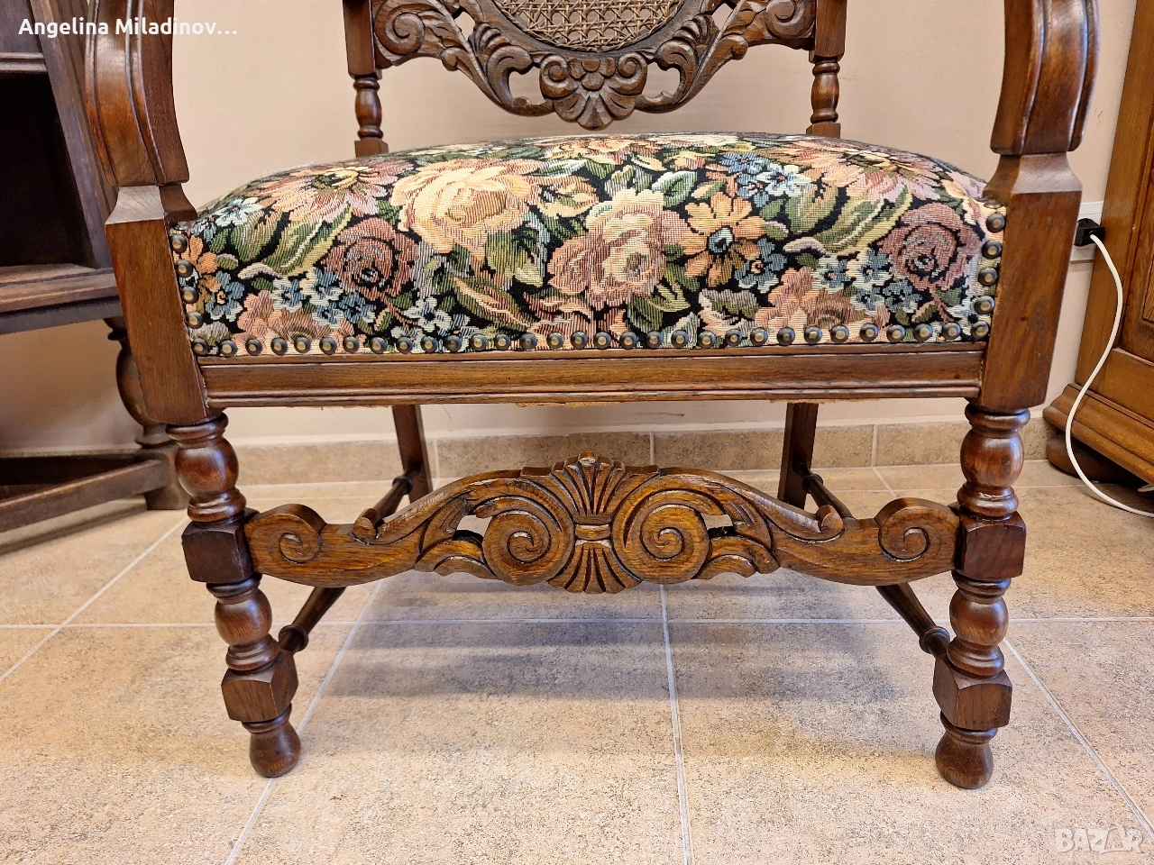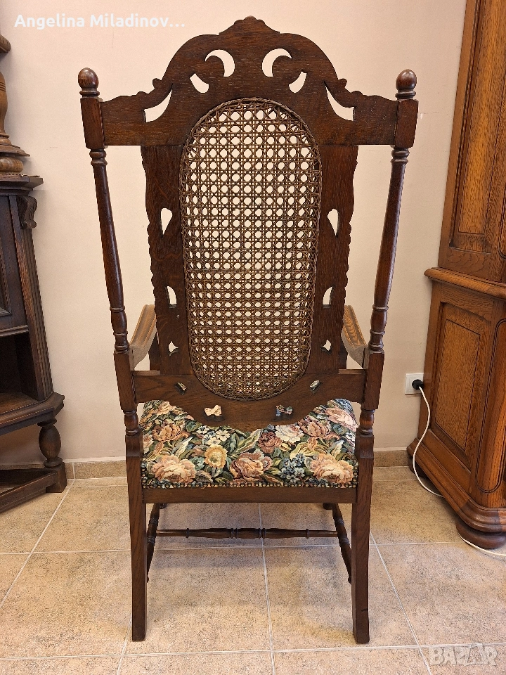 УНИКАТ! Кресло орех масив от края на 19-ти век. Креслото е от Каролското възраждане, обилно издълбано със свитъци и медальони от акантови листа. Гърба на креслото е от естествен ратан. Под ръчно бродираната седалка има елегантна кабриола. Месингови капси допълват красотата на креслото. Разгледайте и другите ми обяви. Последвайте ни и във фейсбук Мебели шик. Предлагаме и изгоден транспорт за цялата страна. Размери: Дължина - 65 см. Ширина - 65 см. Височина - 127 см. Цена - 260 €. 508,52 лв. vintagemebel.olx.bg
