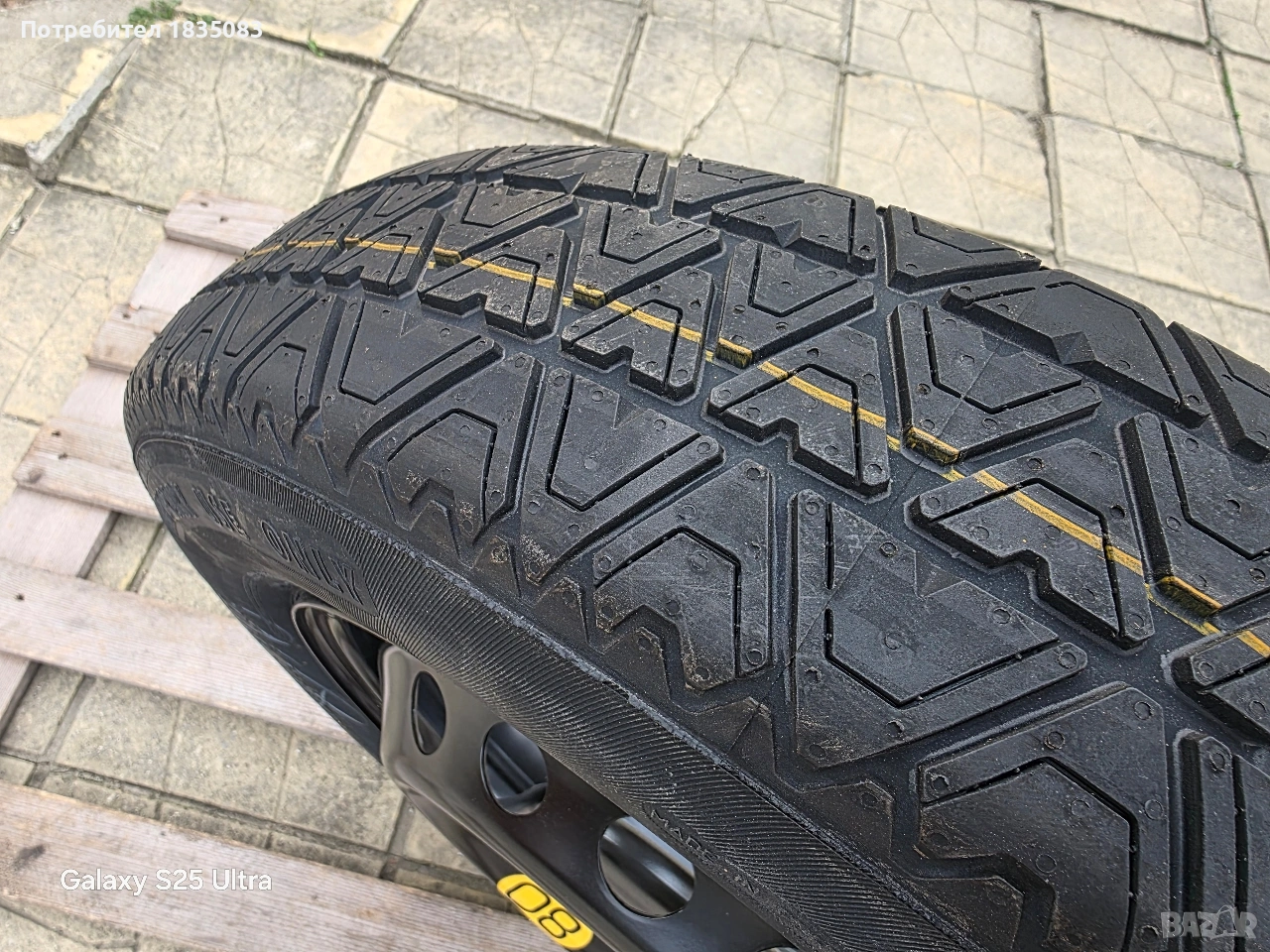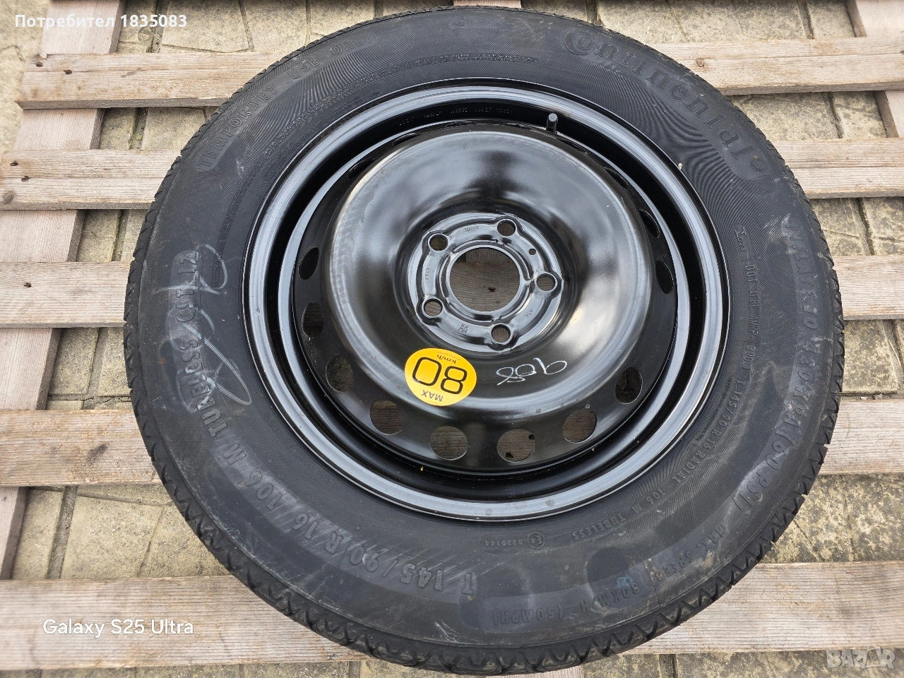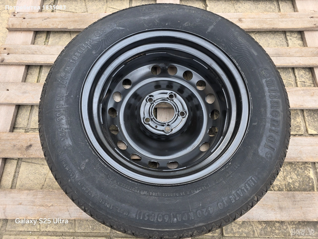 Продавам оригинална резервна гума тип патерица за Нисан, Рено, Дачия и др. с размери 16" 5х114.3 4J ET40 ЦО66.1мм. с гума Continental 145/90/16.