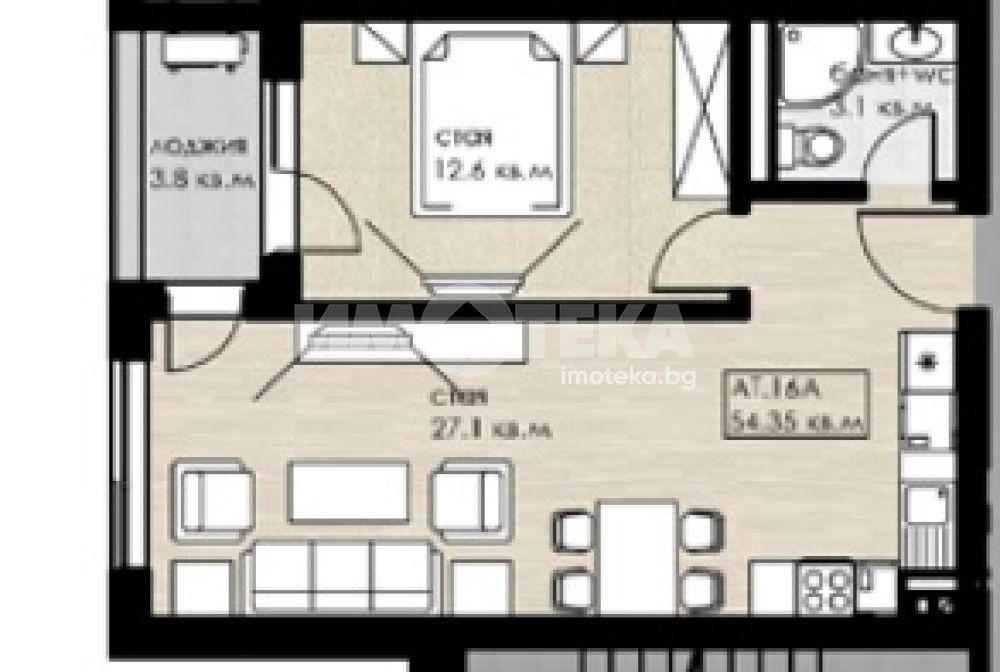 Двустайно ателие Ат.16А със застроена площ от 54.35 кв.м. Разположено е на втори етаж. Състои се от: дневна, спалня, баня с тоалетна и тераса. Изложението е северозападно. Височината под-таван е 2.75 метра.