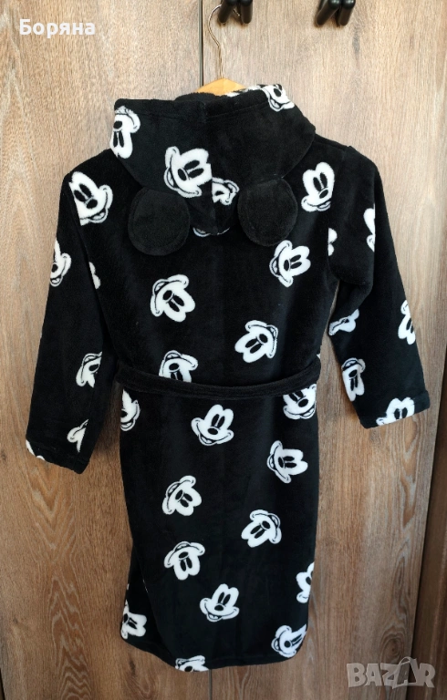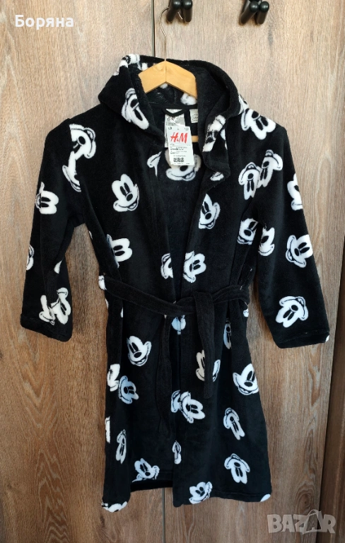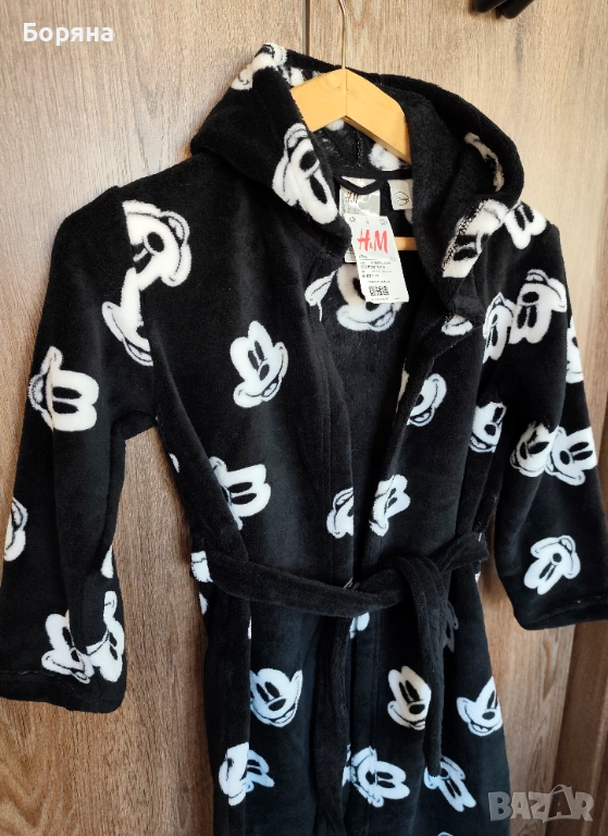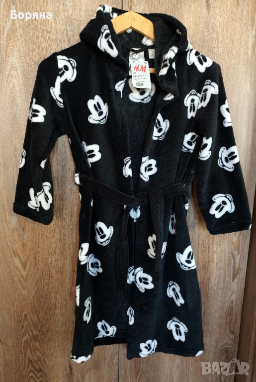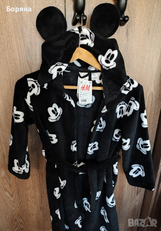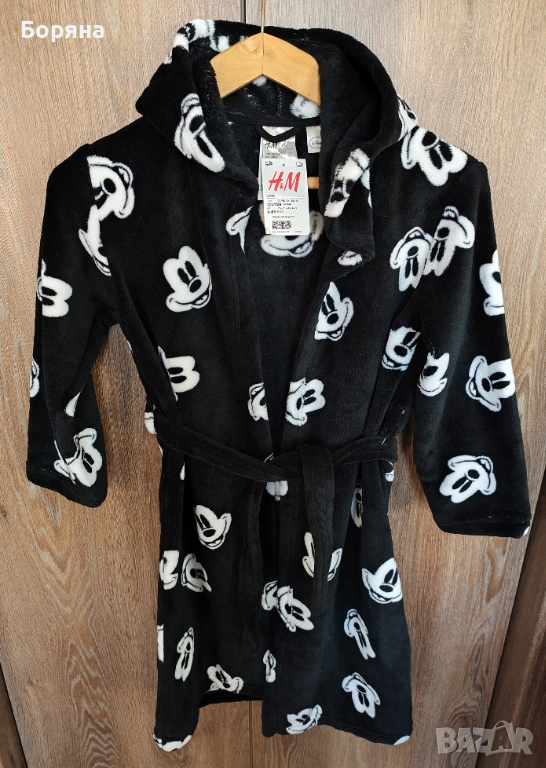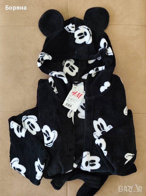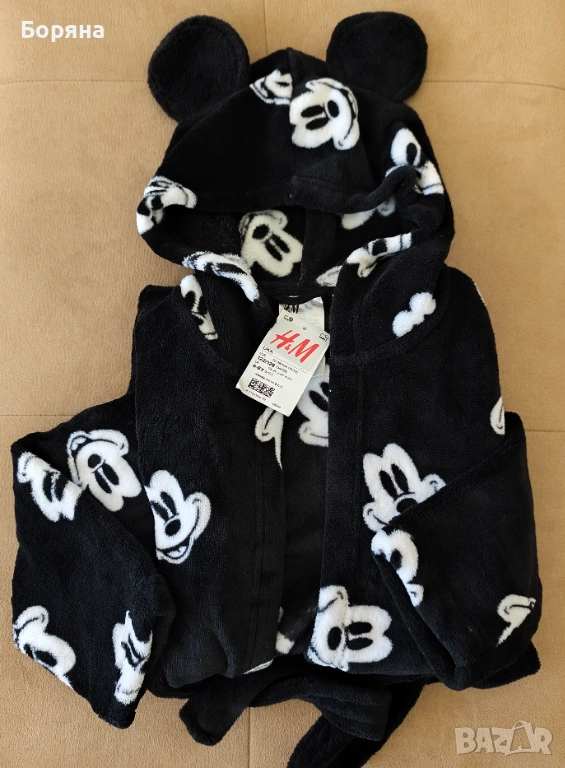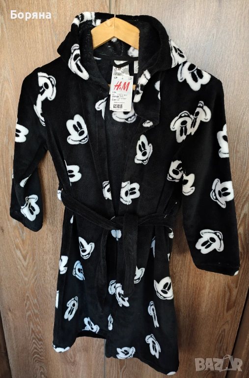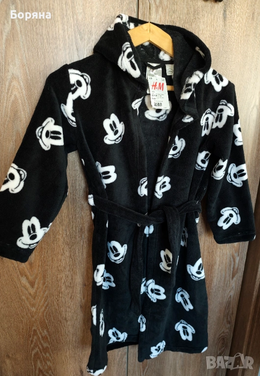 Продавам красиво детско халатче от серията Disney на H&M, ново с етикет, черно на бели мишоци, с големи твърди ушички.