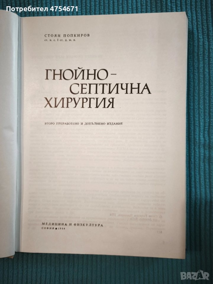 Продавам класическото медицинско издание „Гнойно-септична хирургия“ от бележития български хирург проф. Стоян Попкиров, издателство Медицина и физкултура, София, 1984г., 432 страници, с твърди корици и мека обложка. Това е второ преработено и допълнено издание, което остава фундаментален труд в българската медицинска литература.