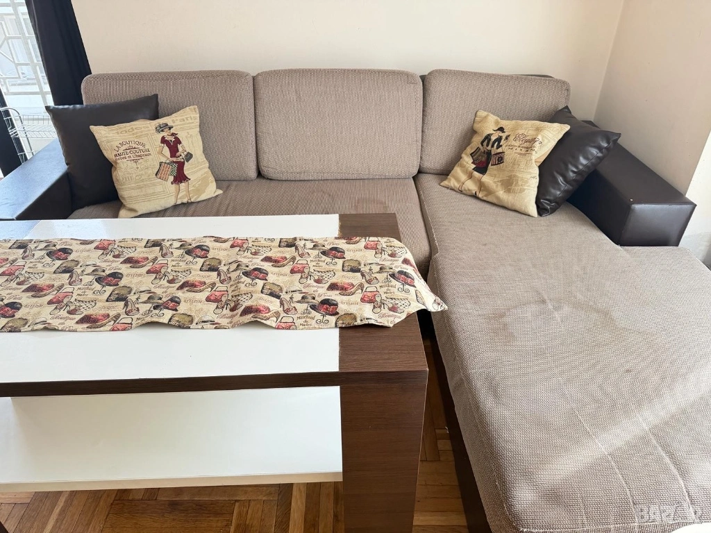 - 100 евро- Ъглов холов диван (240см/175см) с функция за разтягане и шкаф под лежанката. Тапицерията се нуждае от запиране , има леко хлътване на лежанката , има едно закъсано ъгълче . Комфортен както за седене , така и за спане.