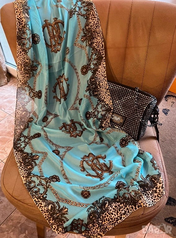 Уникален шал в стил Roberto Cavalli от шифон. Цвят - тюркоазено синьо. Размер 1,30/60 см. Цена 17€.