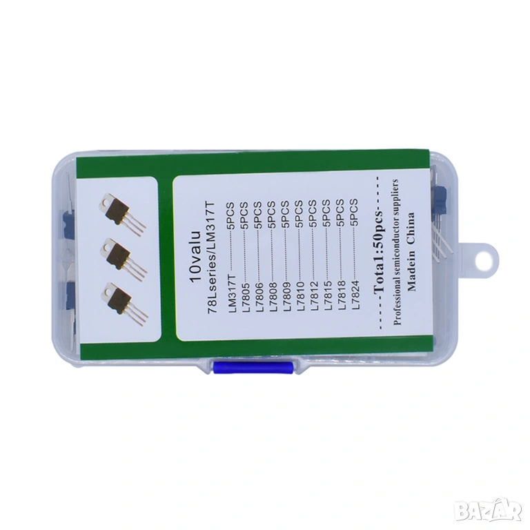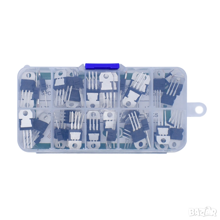 Този универсален комплект съдържа 50 броя стабилизатори на напрежение и транзисторни компоненти, организирани в 10 различни типа (по 5 броя от всеки модел). Подходящ е за изграждане на захранващи схеми, стабилизиране на напрежение и различни електронни приложения.