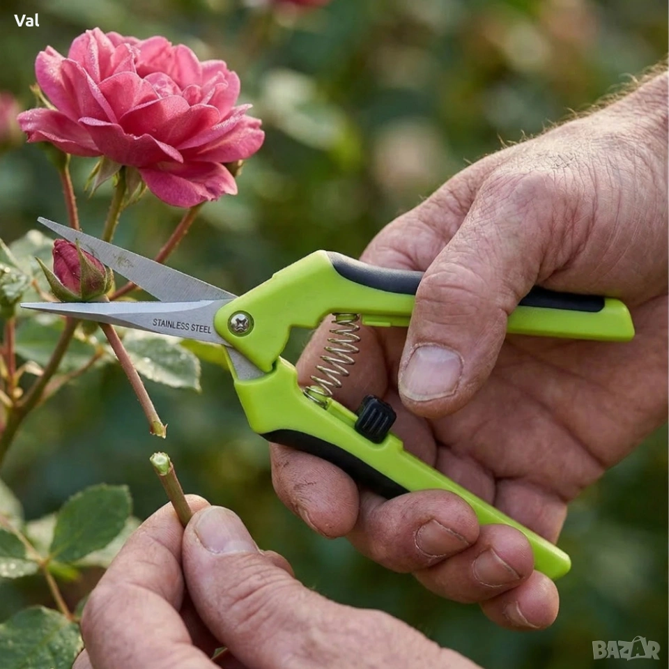Приложение: подрязване на храсти, рози, билки, цветя; премахване на сухи клони; оформяне на декоративни растения