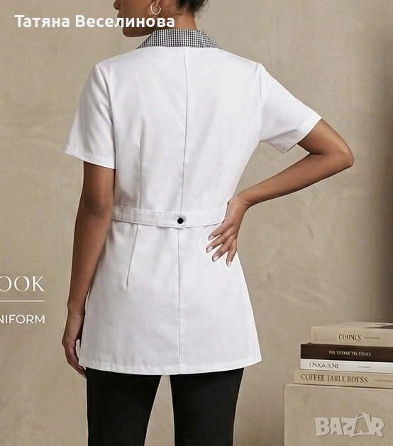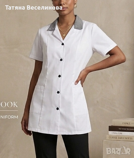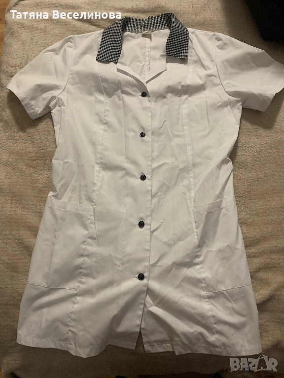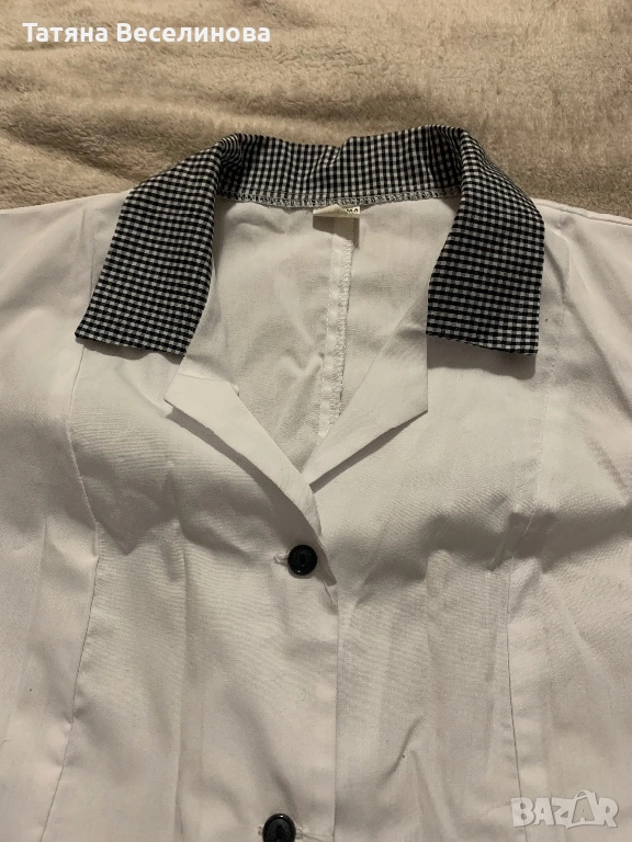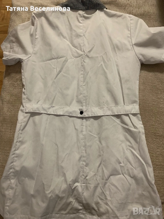 Престилката беше закупена от магазин за професионални униформи “Мидима”. Без забележки е. Има вталена кройка.