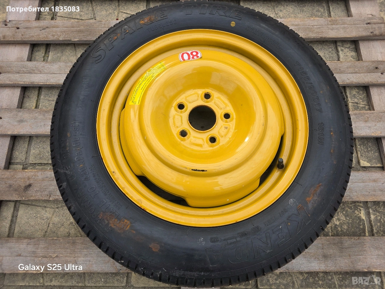 Продавам оригинална резервна гума тип патерица за Хонда ЦР-В и др. с размери 17" 5х114.3 4J ЦО64.1мм. с гума Kenda155/90/17.