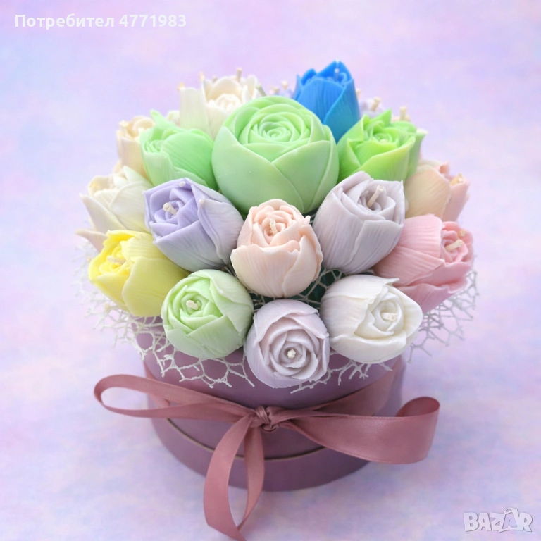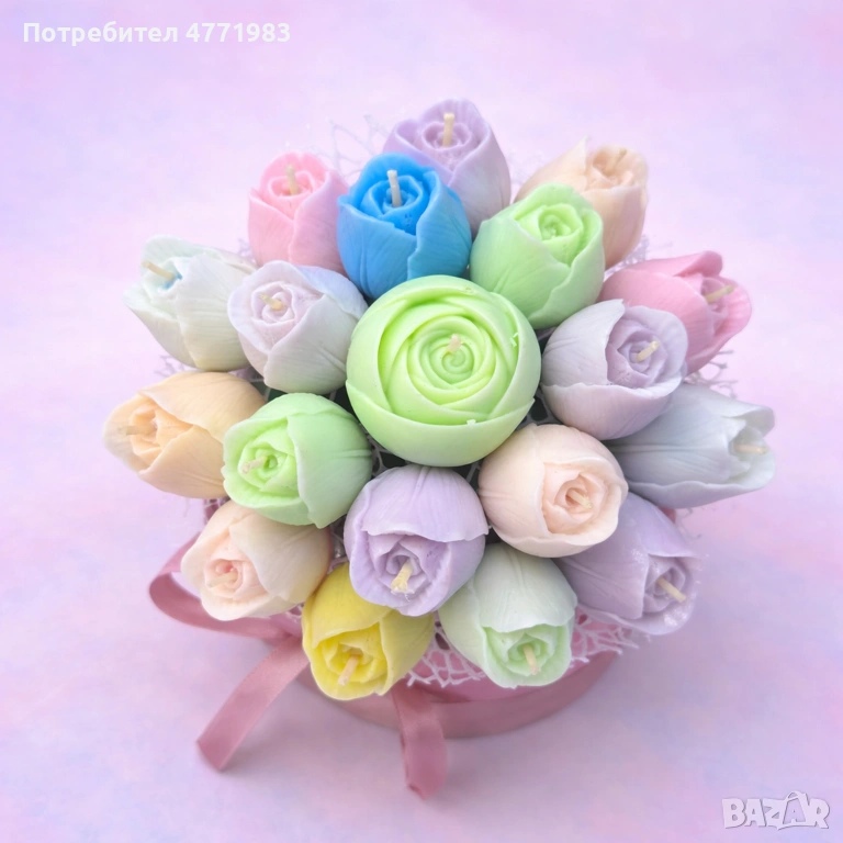 Пастелни лалета е изискан ръчно изработен букет от соеви свещи, създаден да внесе нежност, цвят и фин аромат във всяко пространство. Композицията комбинира луксозни свещи във формата на лалета, подредени като истинска флорална аранжировка с плавни пастелни нюанси и стилна визия.