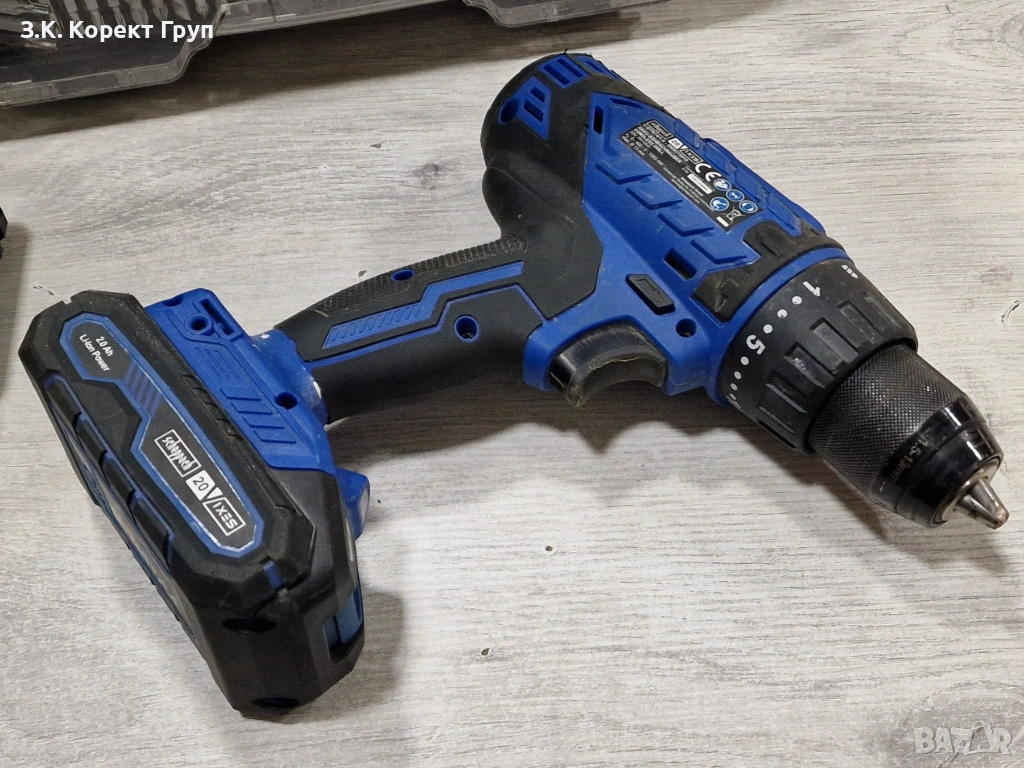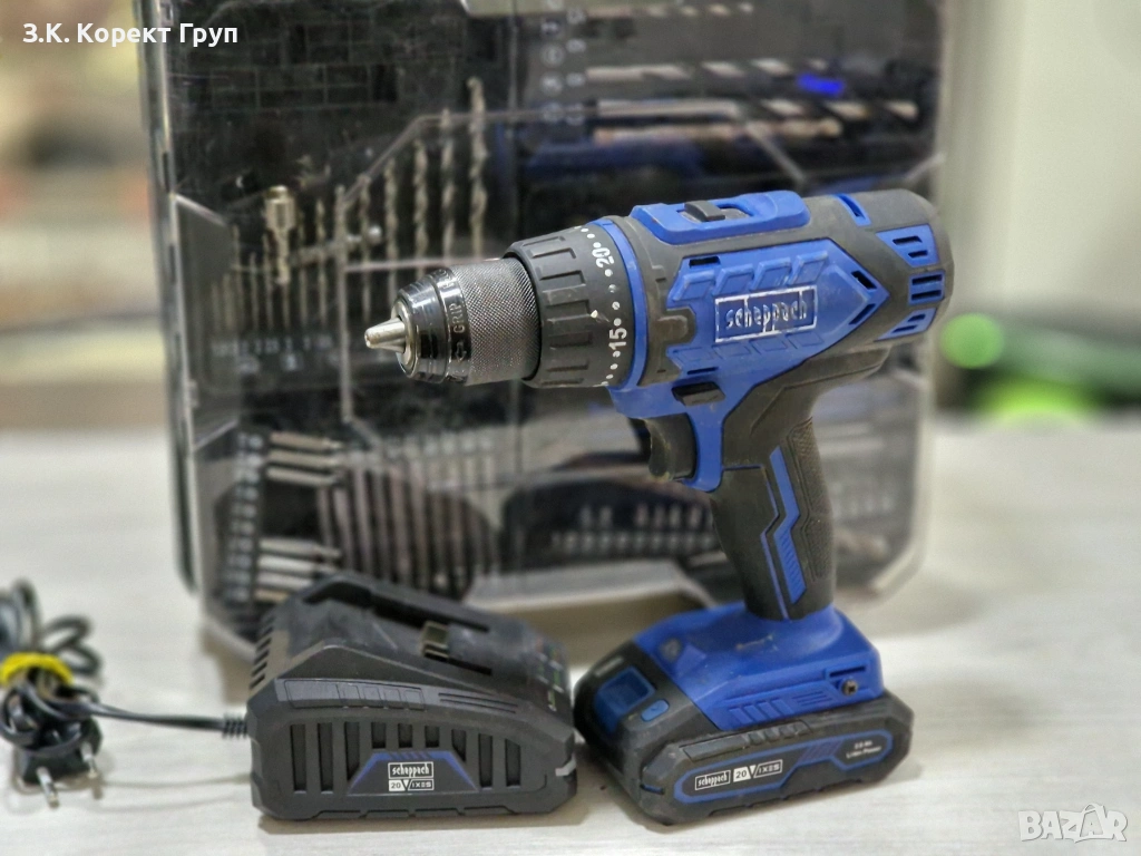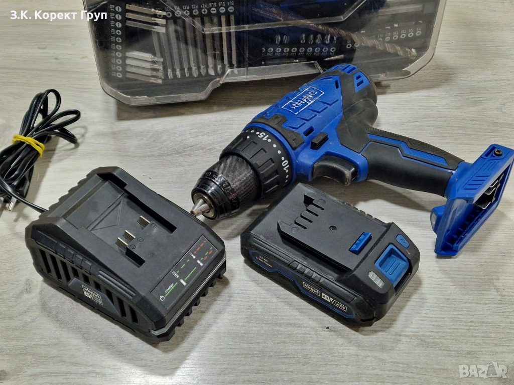 Малко използван винтоверт Scheppach C-DTB74/1-X + оригинални зарядно и батерия 2Ah и куфар с аксесоари(накрайници, ролетка). Работи отлично! Нормални следи от употреба, които не пречат за работата му.