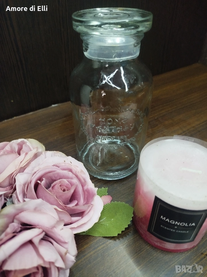 Продавам стилен стъклен буркан в ретро/аптекарски стил с масивен стъклен капак. Бурканът е с красив релефен надпис "Home Fantasy Since 1937" и е изключително подходящ за съхранение на подправки, чайове, ядки или за декорация в дома.