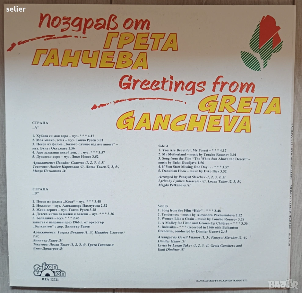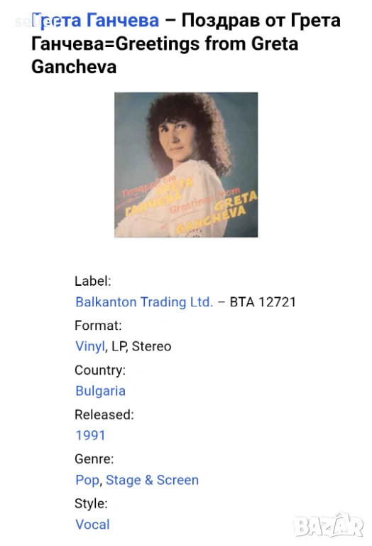 Грета Ганчева – Поздрав от Грета Ганчева Издание на Балкантон 🇧🇬 1991г Състояние на винила:MINT Съ → Обява 53918592