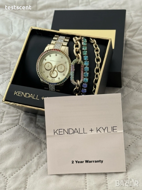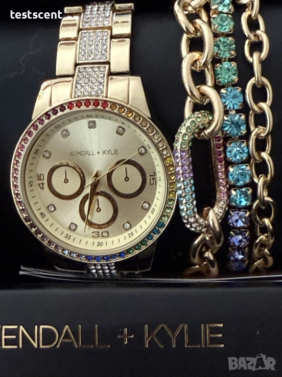 Предлагам стилен и впечатляващ комплект Kendall + Kylie, включващ дамски часовник и подбрани гривни в златист тон с многоцветни кристали. Комплектът е чисто нов (NIB – new in box), никога не е носен, част от лична колекция и съхраняван в оригиналната си опаковка.