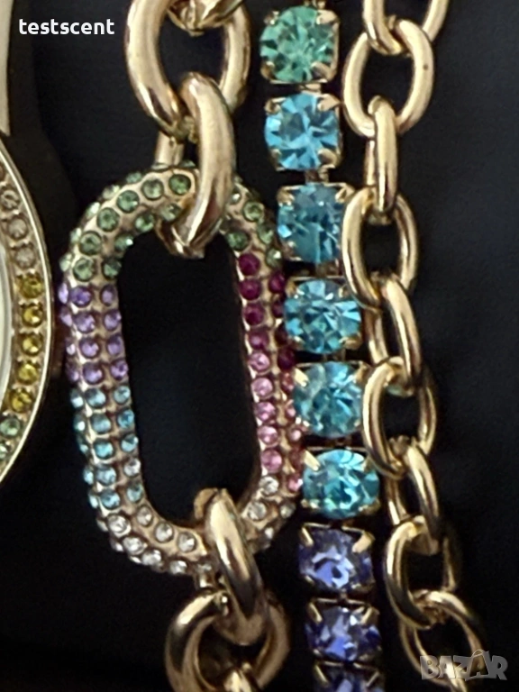 Часовникът се отличава с елегантен gold tone корпус и ефектен multicolor rhinestone безел, който придава блясък и отличителен характер. Допълнен е от стилни гривни с цветни камъни и златисти елементи, създавайки завършена визия – перфектна както за специални поводи, така и за ежедневен лукс.