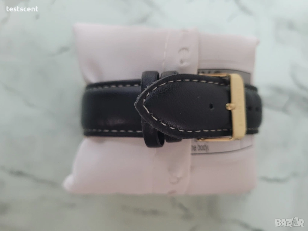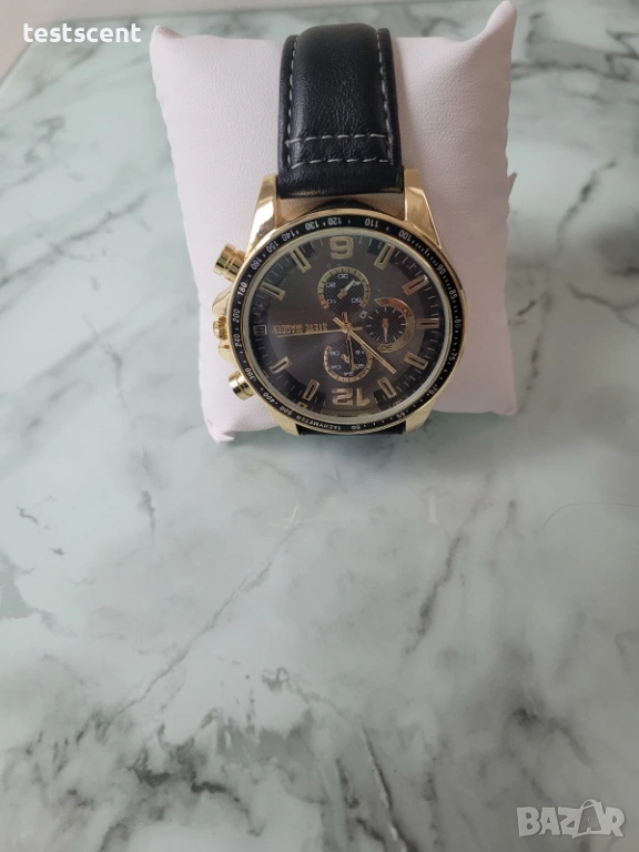 Часовникът впечатлява с изчистен, но изразителен дизайн – златист корпус в комбинация с черен циферблат и кожена каишка, създаващи балансирана визия между класика и съвременен стил. Подходящ както за ежедневие, така и за по-официални поводи.