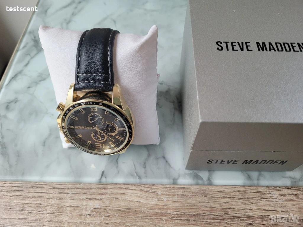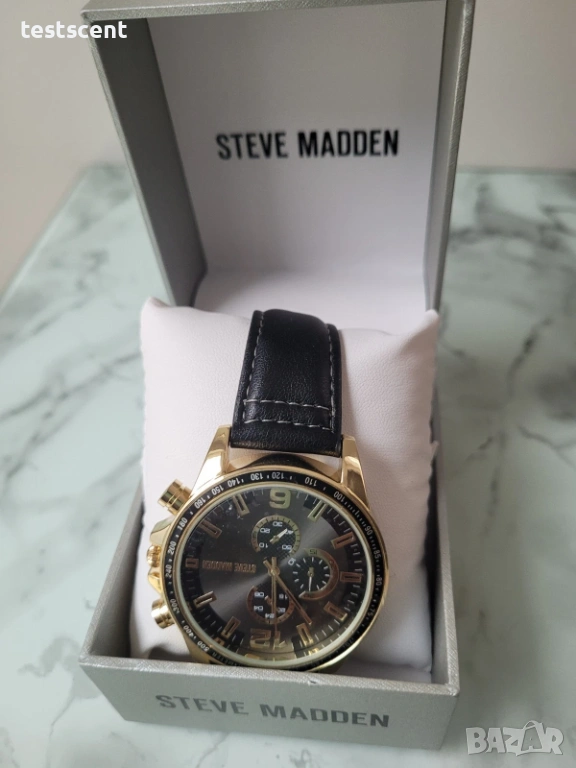 Предлагам стилен и модерен часовник Steve Madden, отличаващ се с елегантна комбинация от черно и златисто. Моделът е чисто нов, неносен, в отлично състояние и идва с оригинална кутия – перфектен избор за подарък или стилно допълнение към визията.