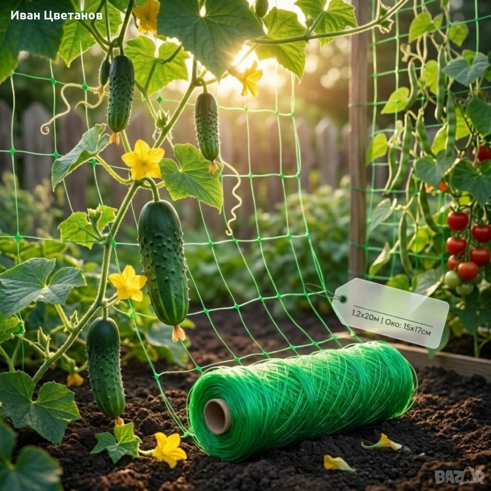 Мрежа за увивни растения и зеленчуци 1.2х20 м, Око 15х17 см – Идеална за краставици, боб
