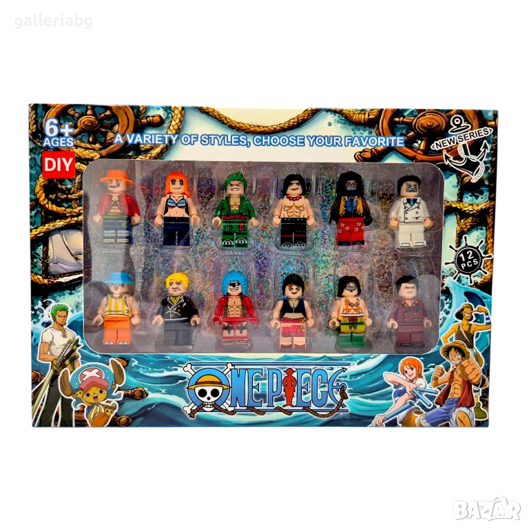 Комплект от 12 мини фигурки с герои от популярната аниме поредица One Piece – страхотен избор за фенове и колекционери.