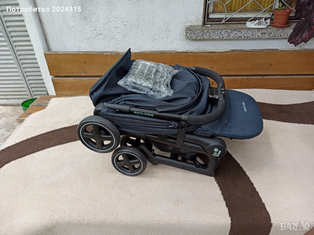 Количката е тъмно синя на цвят.