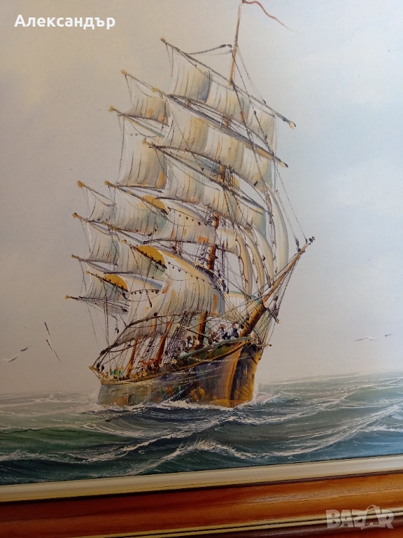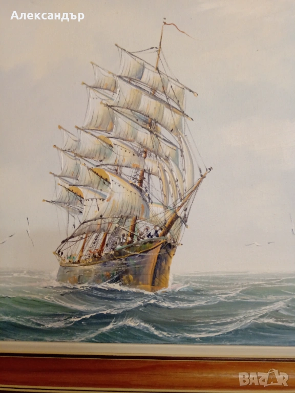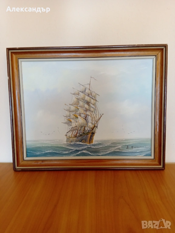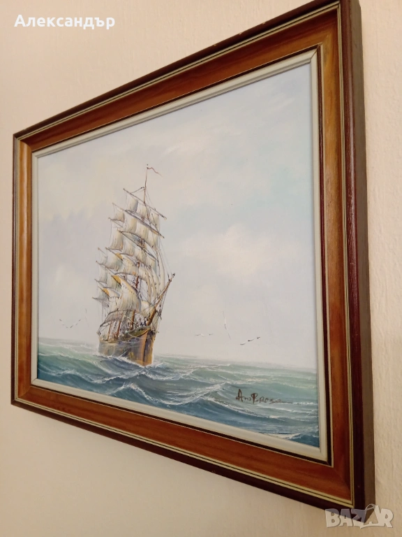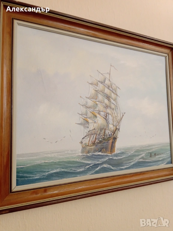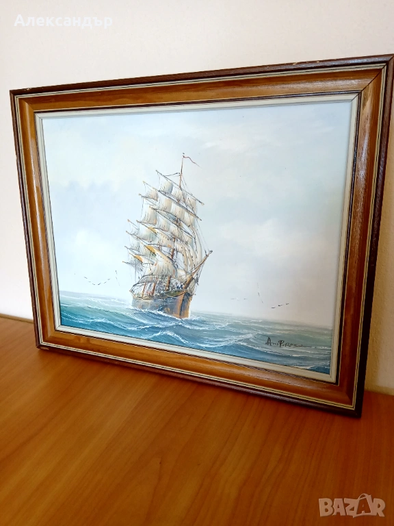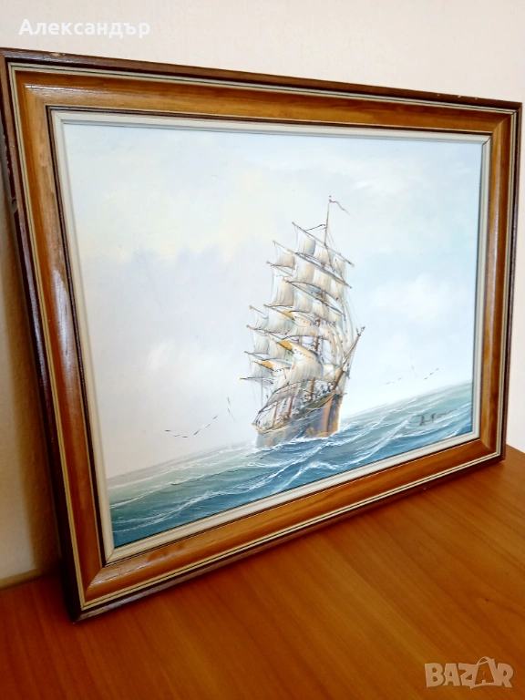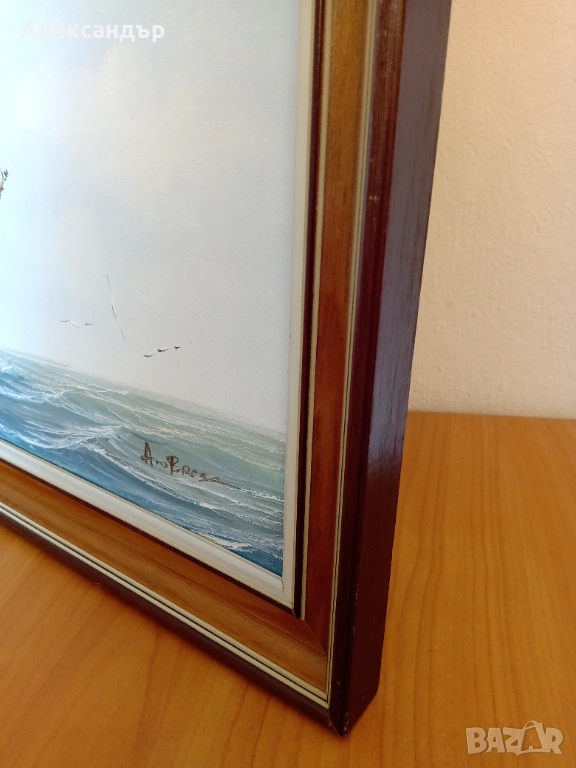 Маслени бои върху платно. Красива дървена рамка и подрамка. Морска тематика. Авторска. Размери на рамката 48,5 на 38,5 см. Платно 40 на 30 см. Много красива и детайлна картина.Реалистични цветове. Като цяло картината е в много състояние.