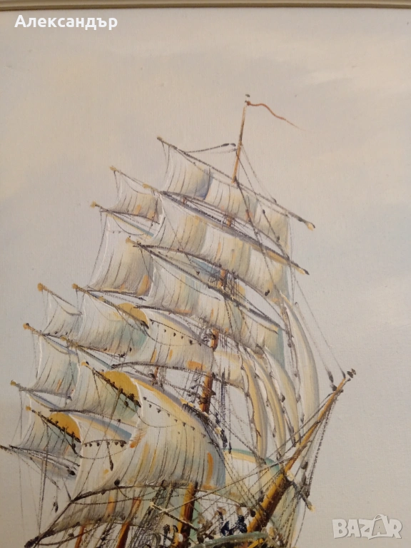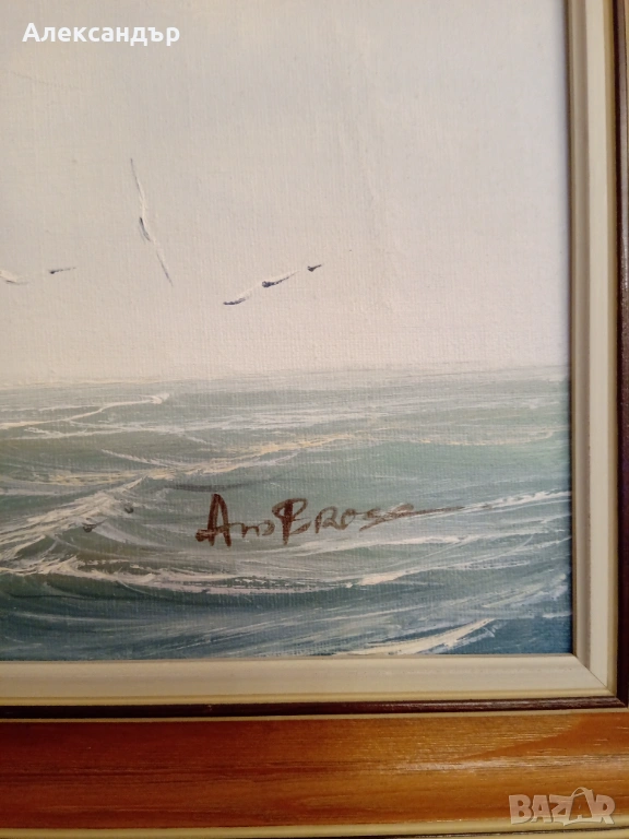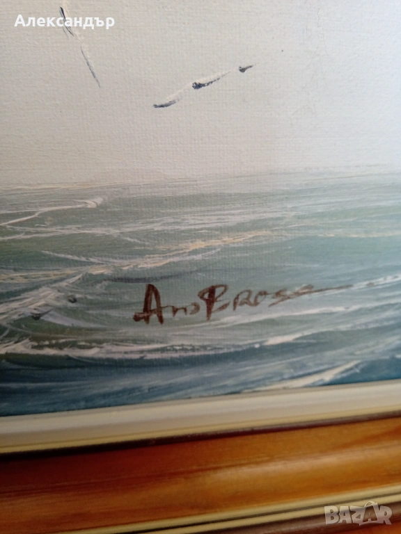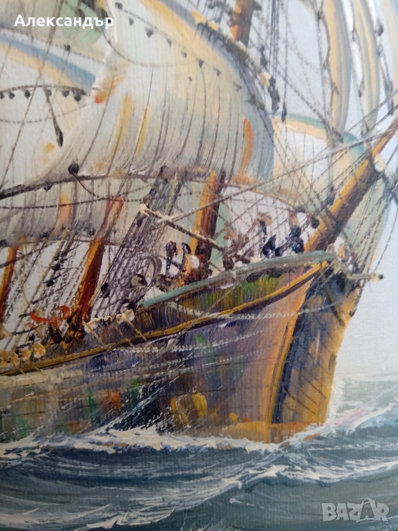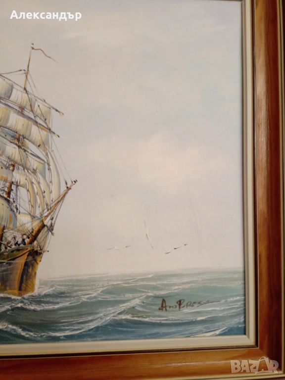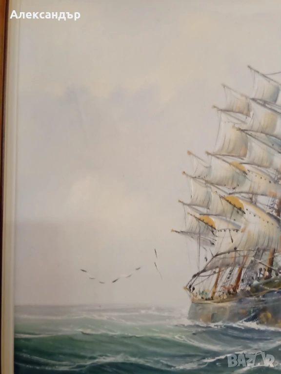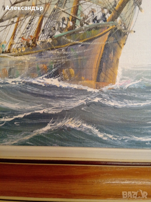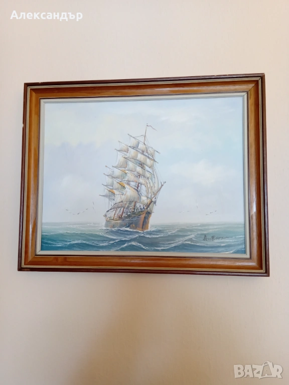 Маслени бои върху платно. Красива дървена рамка и подрамка. Морска тематика. Авторска. Размери на рамката 48,5 на 38,5 см. Платно 40 на 30 см. Много красива и детайлна картина.Реалистични цветове. Като цяло картината е в много състояние.