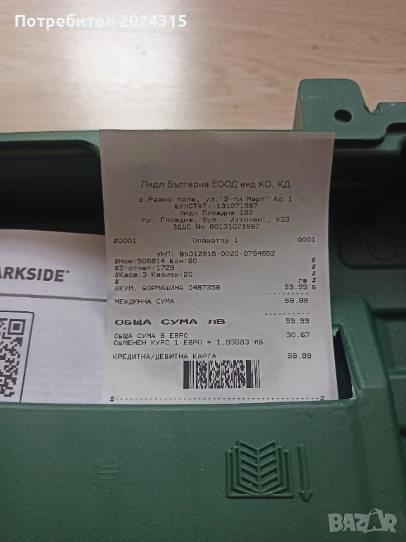 Беше закупен на промоция за 30,67 евро / 59.99 лева.