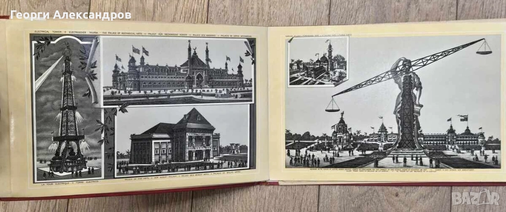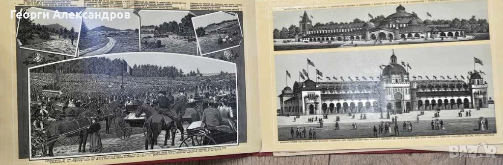 На дясната страница се вижда мащабна композиция, изобразяваща символични фигури, които вероятно олицетворяват индустрията или търговията. Впечатляващо е използването на „кантар“ в дизайна на конструкцията, което подчертава темата за баланса и справедливостта в икономическия обмен. Интересен факт: Изложението е било организирано само за 6 месеца, за да докаже, че Сан Франциско може да бъде домакин на събитие от световна класа, дори в условия на икономическа депресия. Албумът включва тези и други илюстрации, защото те са представяли най-модерното и впечатляващо изкуство и инженерство за 1894 г. Много от тези обекти са били временни, което прави тези графики един от малкото запазени записи за това как е изглеждал паркът тогава. ОТЛИЧНО СЪСТОЯНИЕ! СИМВОЛИЧНА цена! Изпращам само по Еконт с Преглед и отстъпка-транспорт.