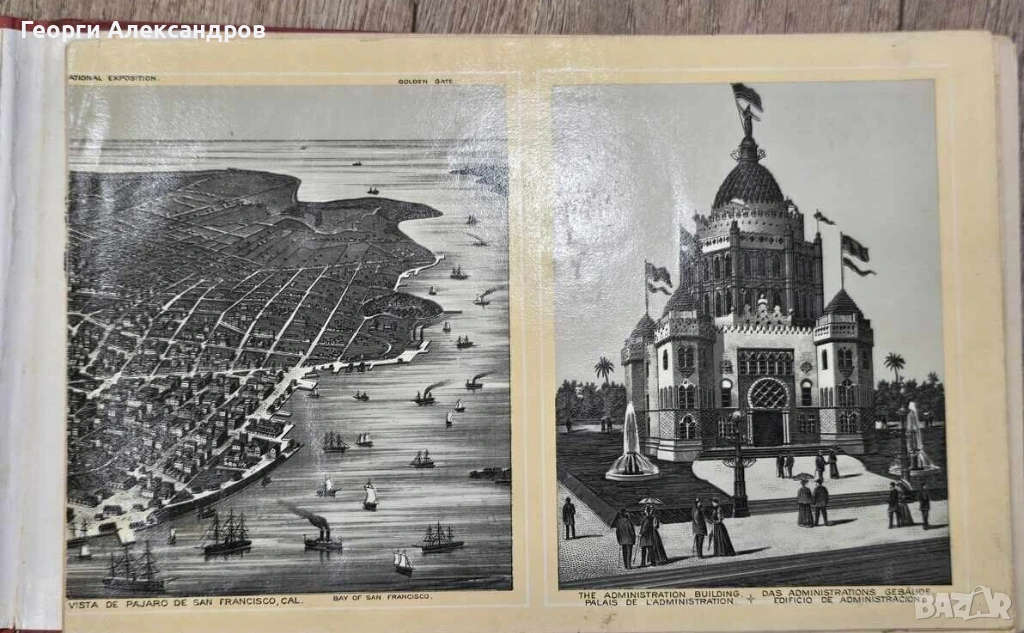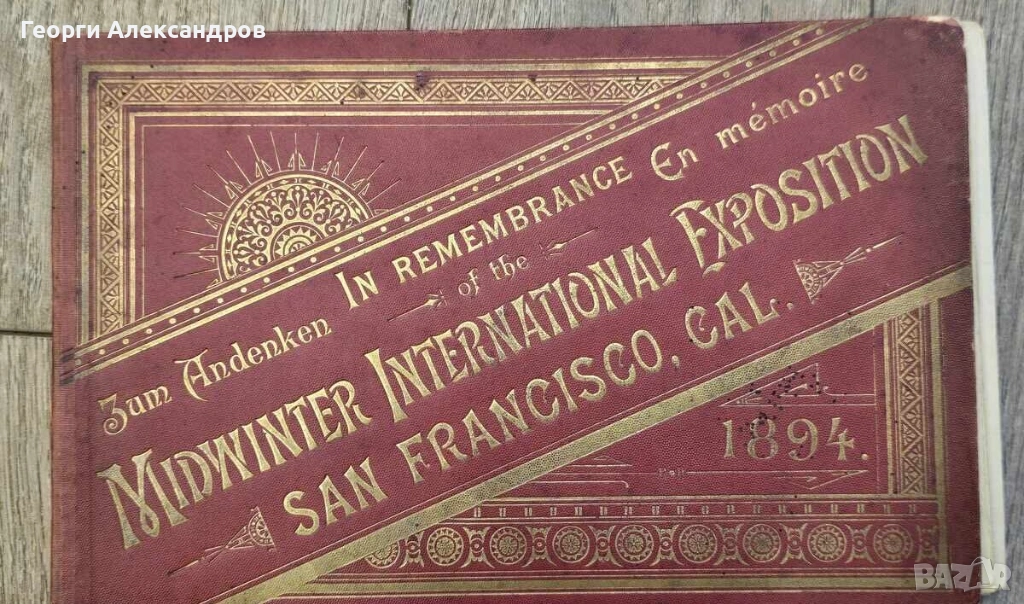 Колекционерско попадение на 132 години - оригинално издание на сувенирна книга от Международното зимно изложение в Калифорния през 1894 г. (Midwinter International Exposition), проведено в Сан Франциско, САЩ.Заглавие: „In Remembrance of the Midwinter International Exposition“ (Zum Andenken / En mémoire). Съдържание: Книгата е съставена в стил „акордеон“ (leporello) и обикновено съдържа 16 страници с илюстрации и снимки на основните сгради и атракции на изложението. Печат: Повечето копия са отпечатани в Германия или от компанията American Souvenir & Advertising Co. в Сан Франциско. Исторически контекст на изложението Изложението се е провело в Голдън Гейт Парк (Golden Gate Park) от януари до юли 1894 г.. То е имало за цел да стимулира икономиката на Калифорния след кризата от 1893 г. и да покаже мекия климат на щата. Две от основните сгради от това време съществуват и днес: музеят de Young (произлязъл от Сградата на изящните изкуства) и Японската чайна градина. Вътрешните страници на албума показват някои от най-впечатляващите обекти на изложението в Сан Франциско от 1894 г. Тези илюстрации са ценни, защото повечето от тези структури са били временни и отдавна не съществуват. Детайли за някои от основните обекти: Електрическата кула (Electrical Tower) Това е била централната атракция на изложението. Висока около 80 метра, тя е била вдъхновена от Айфеловата кула в Париж (построена 5 години по-рано). Кулата е била символ на технологичния прогрес и всяка вечер е била осветявана от хиляди електрически крушки и мощен прожектор на върха – истинско чудо за времето си. Дворецът на механичните изкуства (Palace of Mechanical Arts) Огромна сграда в индийски/мавритански стил с множество куполи и кули. В нея са били изложени най-новите машини и индустриални изобретения на епохата. Дворецът на изящните изкуства (Palace of Fine Arts) Тази сграда е послужила за основа на днешния музей de Young в Голдън Гейт Парк. Тя е една от малкото, чието наследство е оцеляло до днес под формата на културна институция. Алегоричната статуя и фонтанът -