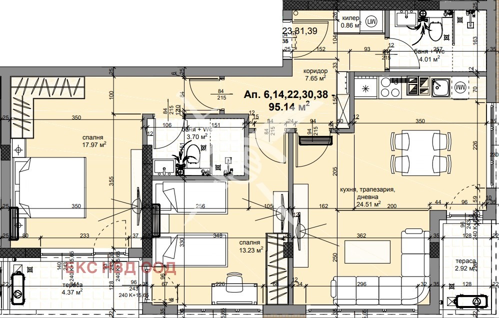 РАЗПРЕДЕЛЕНИЕ: Площ от 112 кв.м, разпределени между голям хол с кухня,две спални,предверие,килер,две бани с тоалтни,две тераси!