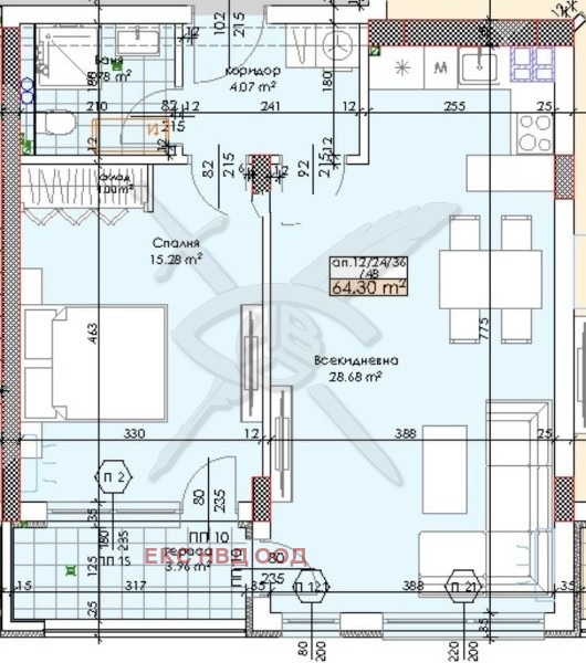 РАЗПРЕДЕЛЕНИЕ: Разполага с площ от 77 кв.м.разгърната в следното функционално разпределение :антре, хол с кухня, баня с тоалетна, спалня, тераса.