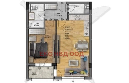РАЗПРЕДЕЛЕНИЕ: Разполага с площ от 72 кв.м.разгърната в следното функционално разпределение :дневна с кухня,спалня,тераса,баня с тоалетна.