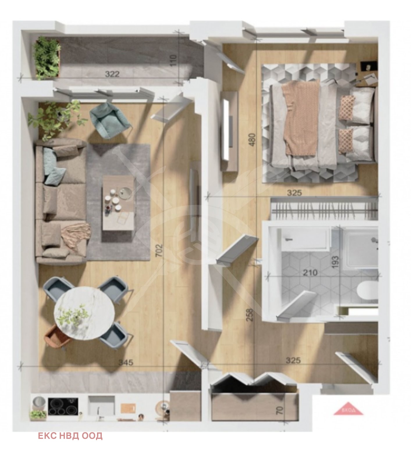 РАЗПРЕДЕЛЕНИЕ: Площ от 75 кв.м, разпределени между хол с кухня,спалня ,коридор ,баня с тоалетна и тераса.