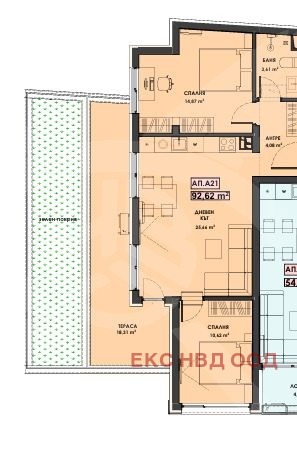 РАЗПРЕДЕЛЕНИЕ: Разполага с площ от 115кв.м., разгърната в следното функционално разпределение: хол с всекидневна и кухненски кът, две спални ,антре, баня с тоалетна и голяма тераса -18.31кв.