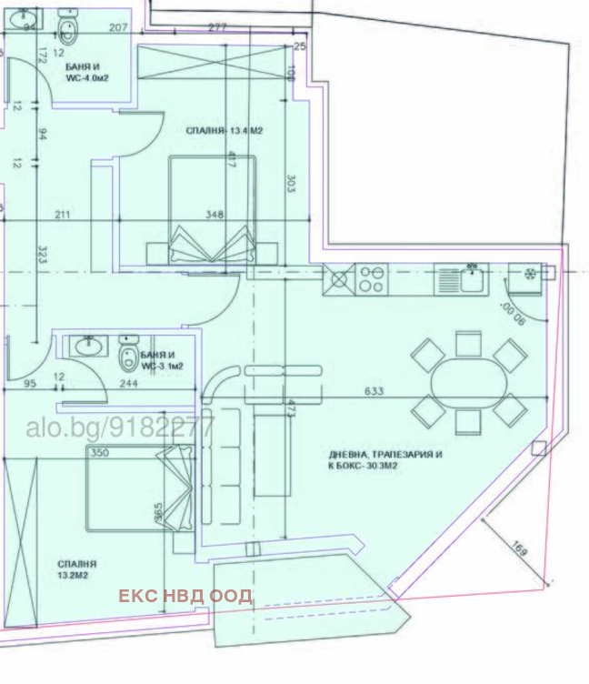 РАЗПРЕДЕЛЕНИЕ: Разполага с площ от 115 кв.м. Състои се от:Дневна с трапезария и кухненски бокс, две спални, баня с тоалетна,коридор.
