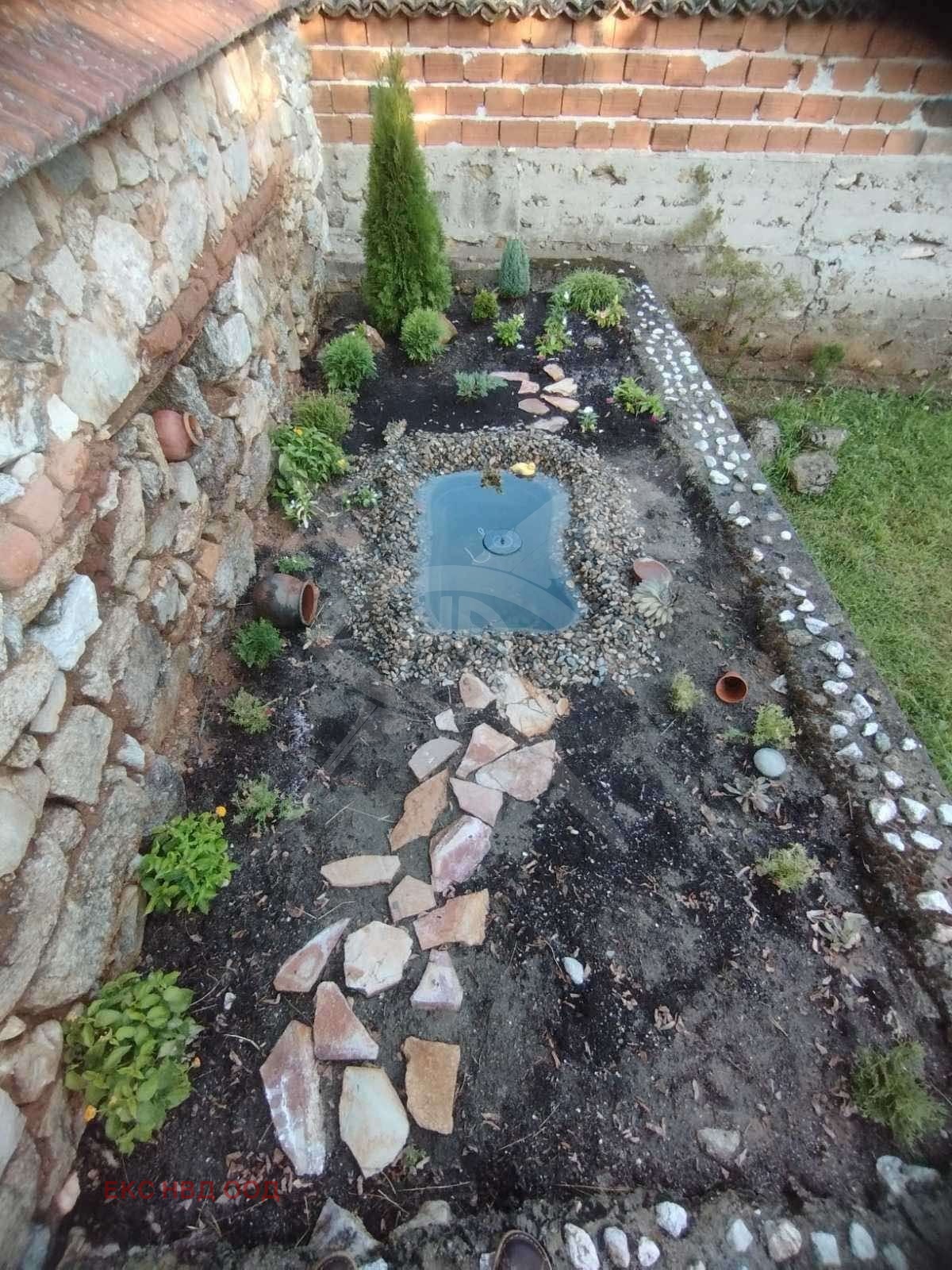 Къщата разполоага с 370кв.м. невероятен двор с райграс и място за събиране и чудесна градина с декоративна каменна зидария и фонтан в нея. На предверието на къщата също има кът за събиране- канапета и масичка за кафе, за да се наслаждавате на всички изгреви и залези, потопени в безгрижие и слънчеви лъчи.
