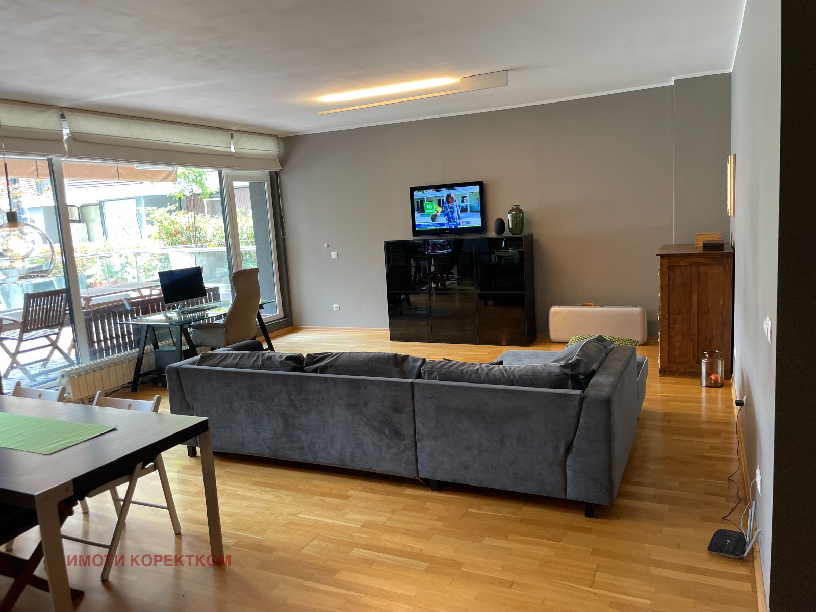 Изключителен имот в сграда Мишел на бул. България, сграда на годината за 2006, слънчево жилище с разпределение - антре, просторен хол с кухня, две спални, коридор, баня и складово помещение. Апартаментът е тих, спокоен и с ниски режийни за отопление през зимата. Страхотна панорамна гледка към Витоша от дневната и терасата пред нея. Изложението на дневната е юг, а спалните са на север. Сградата разполага с денонощна охрана, централна климатизация, в жилищната част - централно отопление от собствен енергиен център с водогрейни котли на природен газ, възможност за индивидуално регулиране на температурата, топломери с дистанционно отчитане.