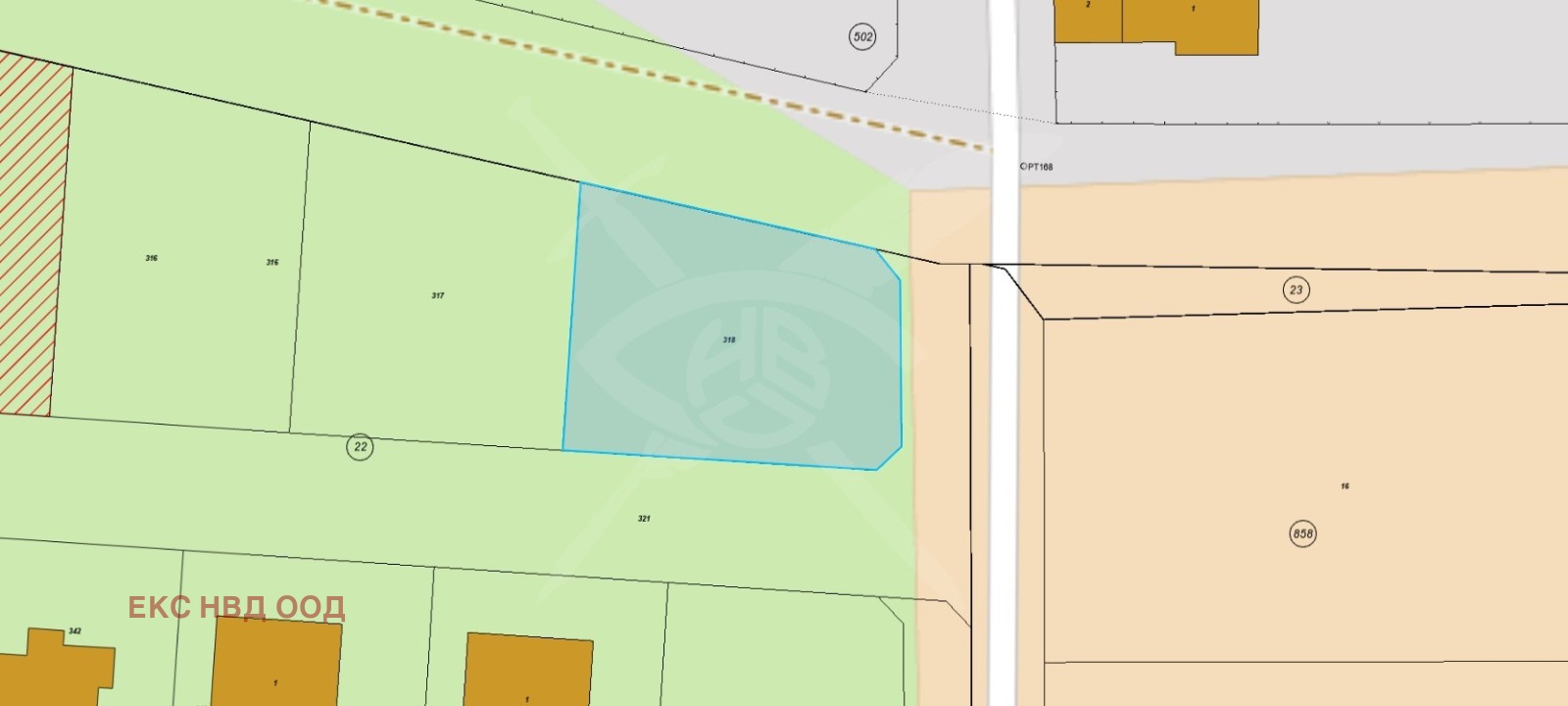 РАЗПРЕДЕЛЕНИЕ: Разполага с площ от 500 кв.м. В регулация. С ток и вода.