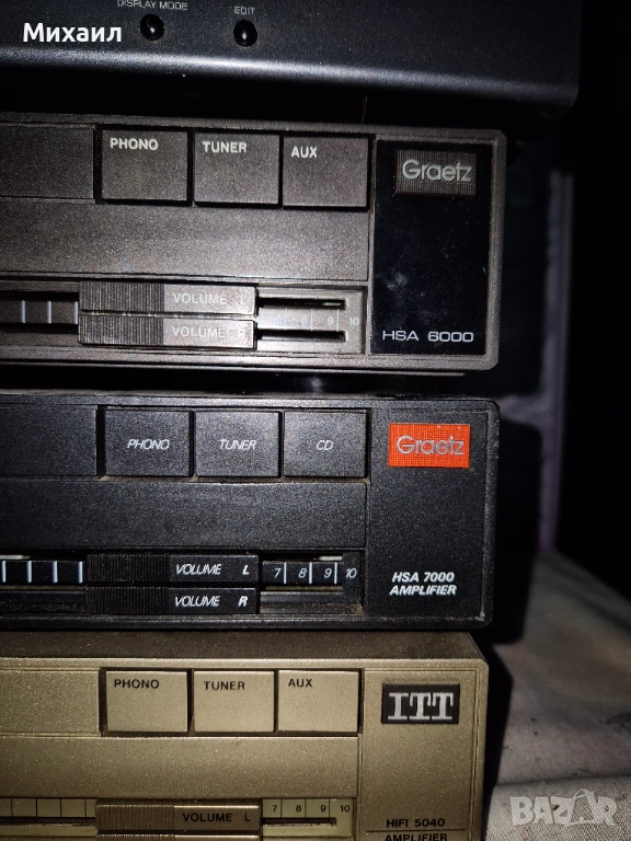 Два усилвателя Graets HSA 6000 и HSA 7000 технически изрядни с добър външен вид без ремонти и липси и тунер ITT (от същата марka) тунера е част от система и се захранва с адаптор 12 волта работи перфектно 45 € за всичка