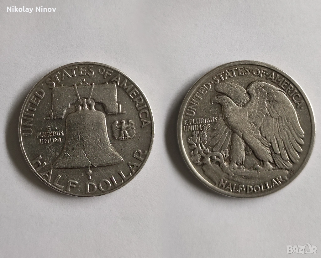 Предлагам две монети от половин долар всяка, в прекрасно състояние, едната е от 1947г, другата от 1962г., две години преди спиране на сеченето на долари от сребро. Изпращане и плащане по договаряне.