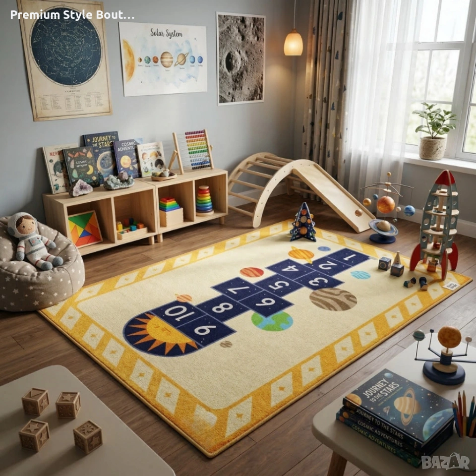 Детски килим за игра 120х160см - Жълт килим с планети и дама, противоплъзгащ и миещ се