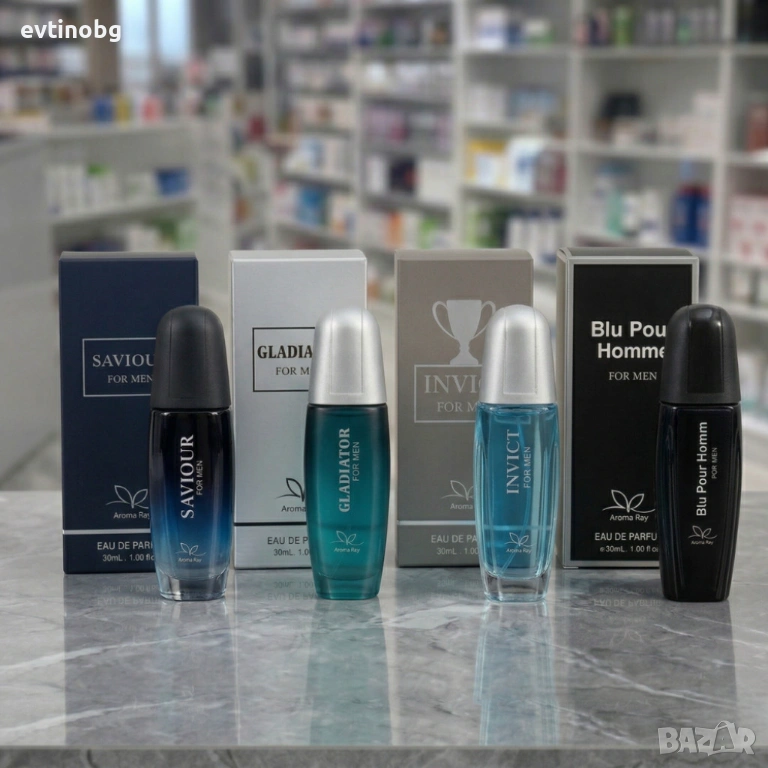 Комплекта включва: Blu Pour Homme - for men 30ml Eau De Parfume, INVICT - for men 30ml Eau De Parfume, GLADIATOR - for men 30ml Eau De Parfume, SAVIOUR - for men 30ml Eau De Parfume.
